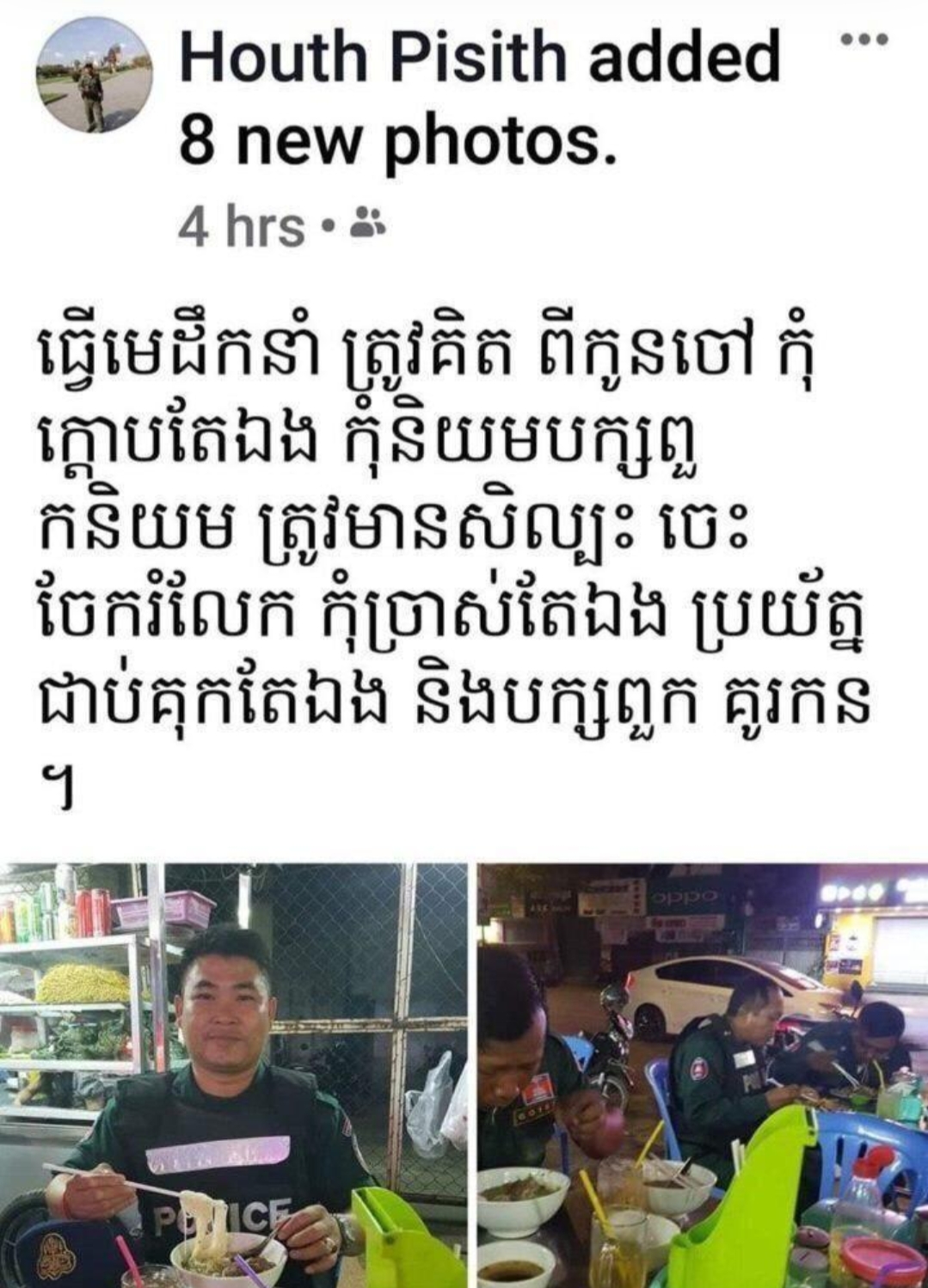 លោកបានបន្ថែមថា មួយវិញទៀត គាត់គឺជាអ្នកអនុវត្តច្បាប់ មិចក៏ពាក្យពេចន៍អីចឹង។ បើមានបញ្ហាផ្ទៃក្នុង គាត់គួរទៅរកថ្នាក់ដឹងនាំឲ្យជួយដោះស្រាយ «បើចឹងមានតែគាត់ ប្រព្រឹត្តអំពើពុករលួយ»។