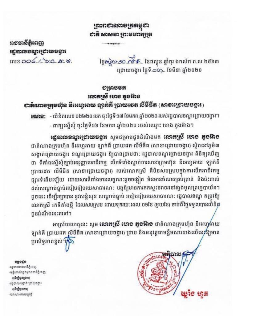 សូមបញ្ជាក់ថា កាលពីថ្ងៃទី៣ ខែមីនា ឆ្នាំ២០២០ អភិបាលខណ្ឌជ្រោយចង្វារ បានជម្រាមជូនម្ចាស់ក្រុមហ៊ុនផ្សារឡាក់គីថា «ទីតាំងផ្សារឡាក់គី សាខាខណ្ឌជ្រោយចង្វារនេះ គឺមិនសមស្របក្នុងការបើកអាជីវកម្មផ្សារទំនើបឡើយ ដោយសារតែទីតាំងមានលក្ខណៈតូចចង្អៀត មិនមានចំណតគ្រប់គ្រាន់ និងប៉ះពាល់ដល់សណ្តាប់ធ្នាប់ របៀបរៀបរយសាធារណៈ បង្កឱ្យមានការកកស្ទះចរាចរនៅរង្វង់មូលព្រហ្មបាយ័ន។ ដូច្នេះដើម្បីរក្សាបាននូវសន្តិសុខ សណ្តាប់ធ្នាប់ រដ្ឋបាលខណ្ឌ តម្រូវឱ្យម្ចាស់ផ្សាររកទីតាំងថ្មី ដែលសមស្របដោយទុកពេលឱ្យ ០១ខែ ចាប់ពីថ្ងៃទទួលបានលិខិតជូនដំណឹង»។