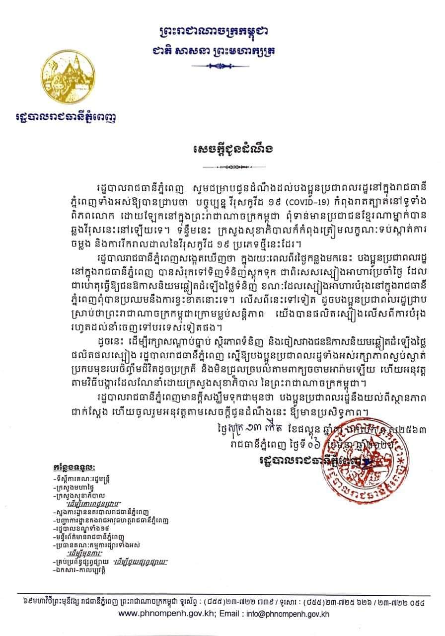សេចក្ដីជូនដំណឹងនៅថ្ងៃទី០៦ ខែមីនា ឆ្នាំ២០២០ បានឲ្យដឹងថា រដ្ឋបាលរាជធានីភ្នំពេញ បានណែនាំឲ្យប្រជាពលរដ្ឋរក្សាសណ្ដាប់ធ្នាប់ ស្ថិរភាពទំនិញ