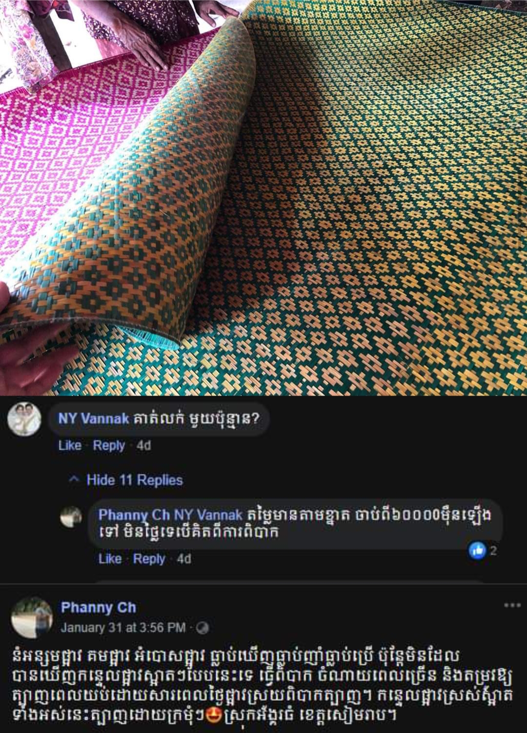 សៀមរាប÷ពេលកន្លងទៅមានគណនីហ្វេបុកមួយឈ្មោះ Phanny Chបានធ្វើការបង្ហោះសារទាក់ទងនឹងកន្ទេលផ្អាវស្អាតៗដែលបានត្បាញដោយផ្ទាល់ដៃរបស់លោកយាយស្ថិតនៅស្រុកអង្គរធំ ខេត្តសៀមរាប។រូបភាពកន្ទេលផ្អាវស្អាតៗទាំងអស់នោះទទួលបានការចាប់អារម្មណ៍យ៉ាងច្រើនពីសំណាក់ប្រិយមិត្តអ្នកប្រើប្រាស់បណ្ដាញសង្គមហ្វេបុក។