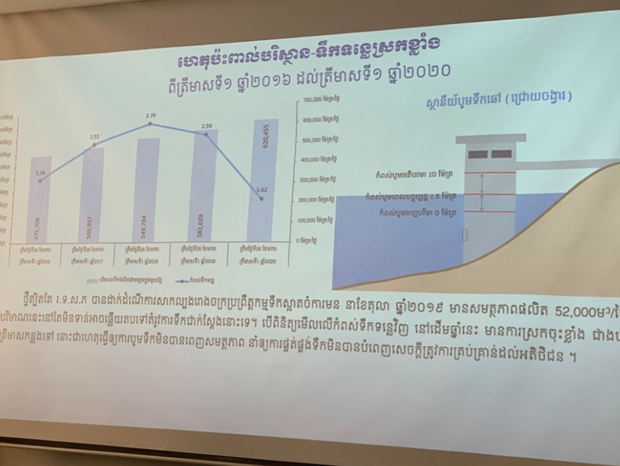 ឯកឧត្តមអគ្គនាយកបានបញ្ជាក់ថា សព្វថ្ងៃនេះ រដ្ឋាករទឹកស្វយ័តរាជធានីភ្នំពេញ មានសមត្ថភាពផលិតទឹកស្អាតបានទំហំត្រឹមតែជាង៦០ម៉ឺនម៉ែត្រគុប ក្នុងមួយថ្ងៃប៉ុណ្ណោះ ខណៈតម្រូវការប្រើប្រាស់ជាក់ស្តែង ជាង៧០ម៉ឺនម៉ែត្រគុបក្នុង១ថ្ងៃ មានន័យថា យើងខ្វះទឹក ប្រើប្រាស់ប្រមាណ១០ម៉ឺនម៉ែត្រគុបក្នុង ១ថ្ងៃ ដែលបានធ្វើឱ្យទឹកតំបន់ជាយក្រុងមានការ ខ្វះទឹកប្រើប្រាស់ខ្លាំង។