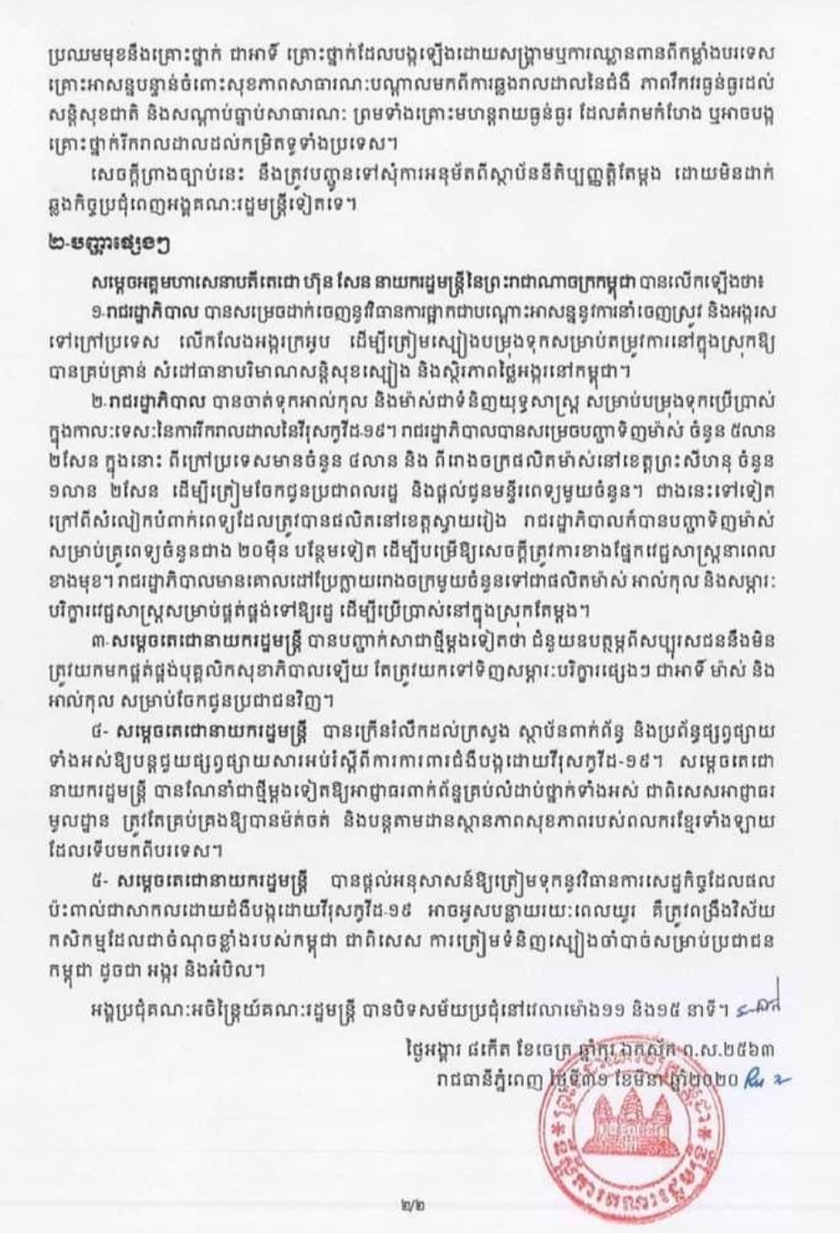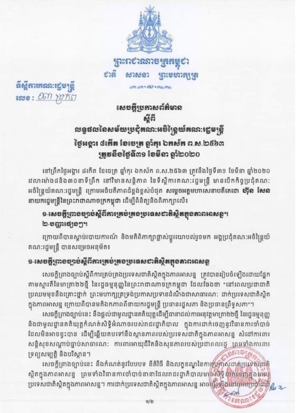 នេះបើយោងតាមសេចក្តីប្រកាសព័ត៌មាន ស្តីពី “លទ្ធផលនៃសម័យប្រជុំគណៈអចិន្ត្រៃយ៍គណៈរដ្ឋមន្ត្រី” នៅថ្ងៃទី៣១ ខែមីនា ឆ្នាំ២០២០ នេះ ក្រោមអធិបតីភាពដ៏ខ្ពង់ខ្ពស់របស់សម្តេចតេជោ ហ៊ុន សែន នាយករដ្ឋមន្ត្រីនៃកម្ពុជា ។