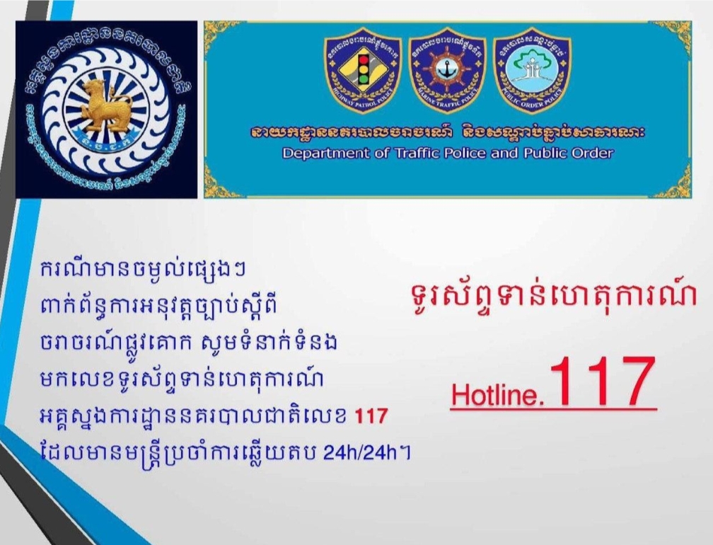 (ភ្នំពេញ)៖ ដើម្បីផ្តល់ភាពងាយស្រួលដល់ដល់បងប្អូនប្រជាពលរដ្ឋ ដែលមានចម្ងល់អំពីច្បាប់ចរាចរណ៍ ពិសេសការអនុវត្តន៍ការផាកពិន័យចំពោះការល្មើសច្បាប់ចរាចរណ៍ តាមអនុក្រឹត្យថ្មីនោះ អគ្គស្នងការដ្ឋាននគរបាលជាតិ បានដាក់ឲ្យដំណើរការជាផ្លូវការលេខទូស័ព្ទទាន់ហេតុការណ៍ ១១៧ ដែលមានមន្ត្រីប្រចាំការ២៤ម៉ោងលើ២៤ម៉ោង។