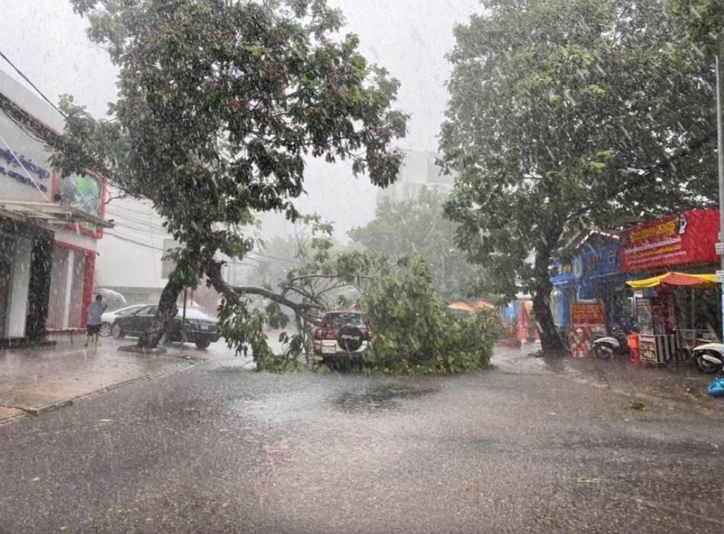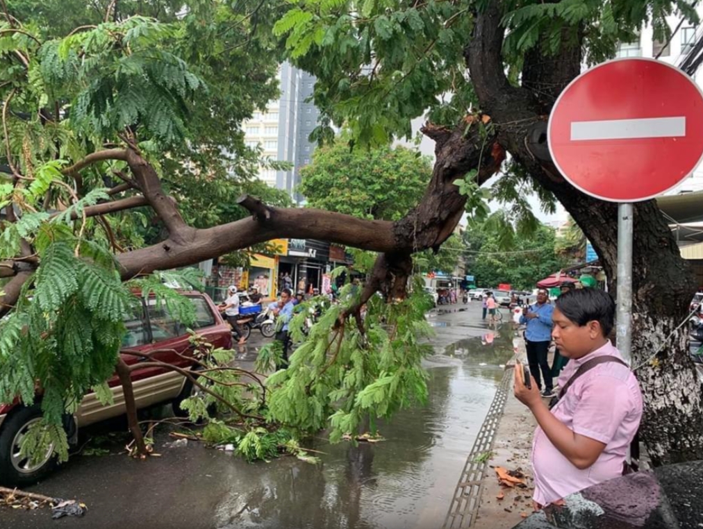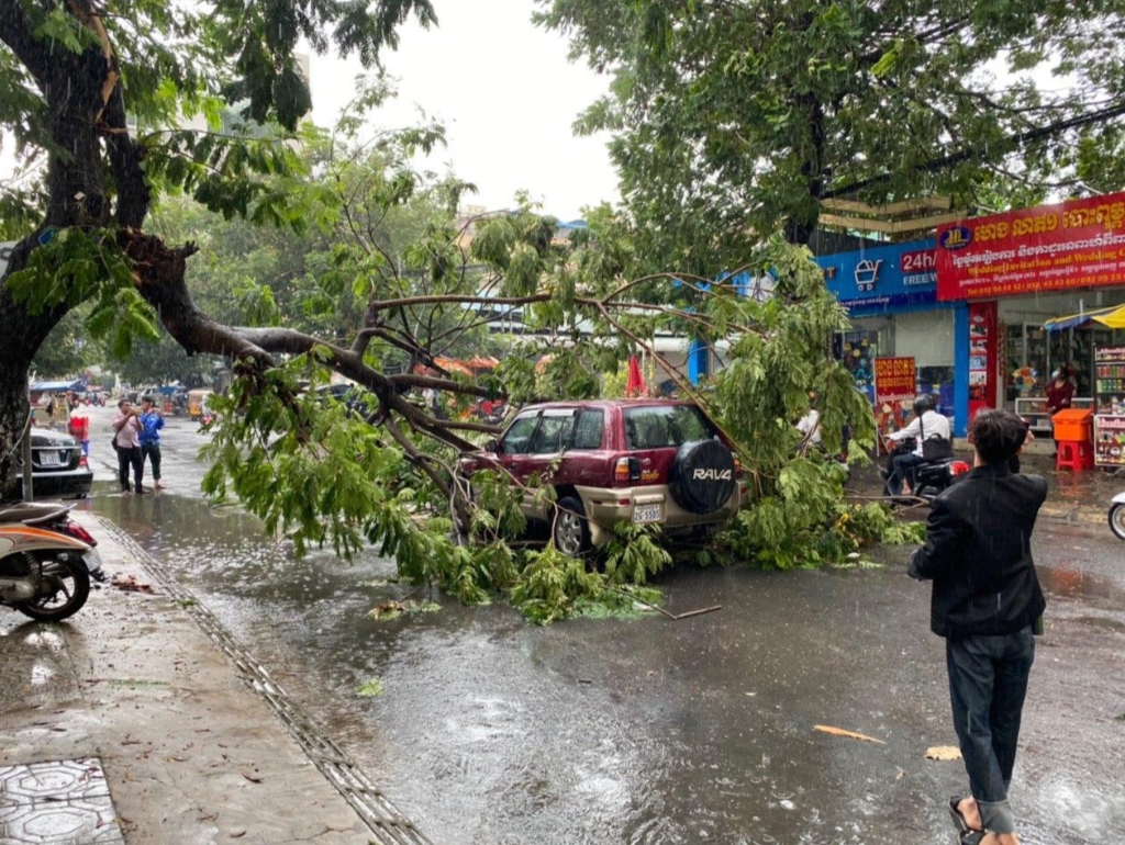 (ភ្នំពេញ)៖ ដើមត្រសេកធំមួយដើម ត្រូវបានបាក់សង្កត់លើរថយន្តមួយគ្រឿង ក្រោយពីមេឃភ្លៀងមួយមេធំ រួមជាមួយខ្យល់បោកបក់យ៉ាងខ្លាំង តែសំណាងល្អមិនបង្កឲ្យមានមនុស្សរងរបួសឡើយ។