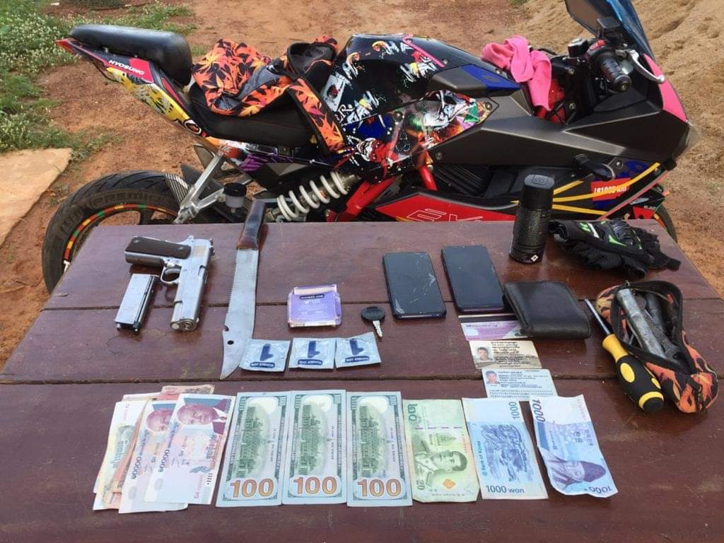 -ម៉ូតូ០១គ្រឿង ម៉ាកKR ពណ៌ក្រហម សេរី២០១៧ពាក់ស្លាកលេខ ភ្នំពេញ 1GE .9910 ជនសង្ស័យទាំង០២នាក់និងសម្ភារៈខាងលើ បានឃាត់ខ្លួននាំមកកាន់អធិការរដ្ឋាននគរបាលស្រុក ដើម្បីសួរនាំតាមនីតិវិធីច្បាប់៕