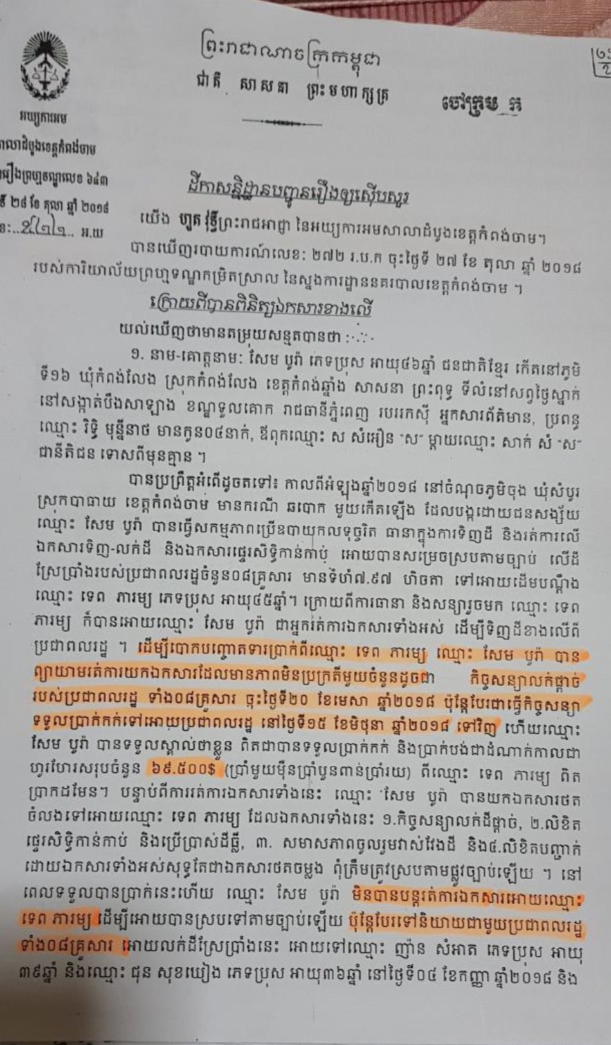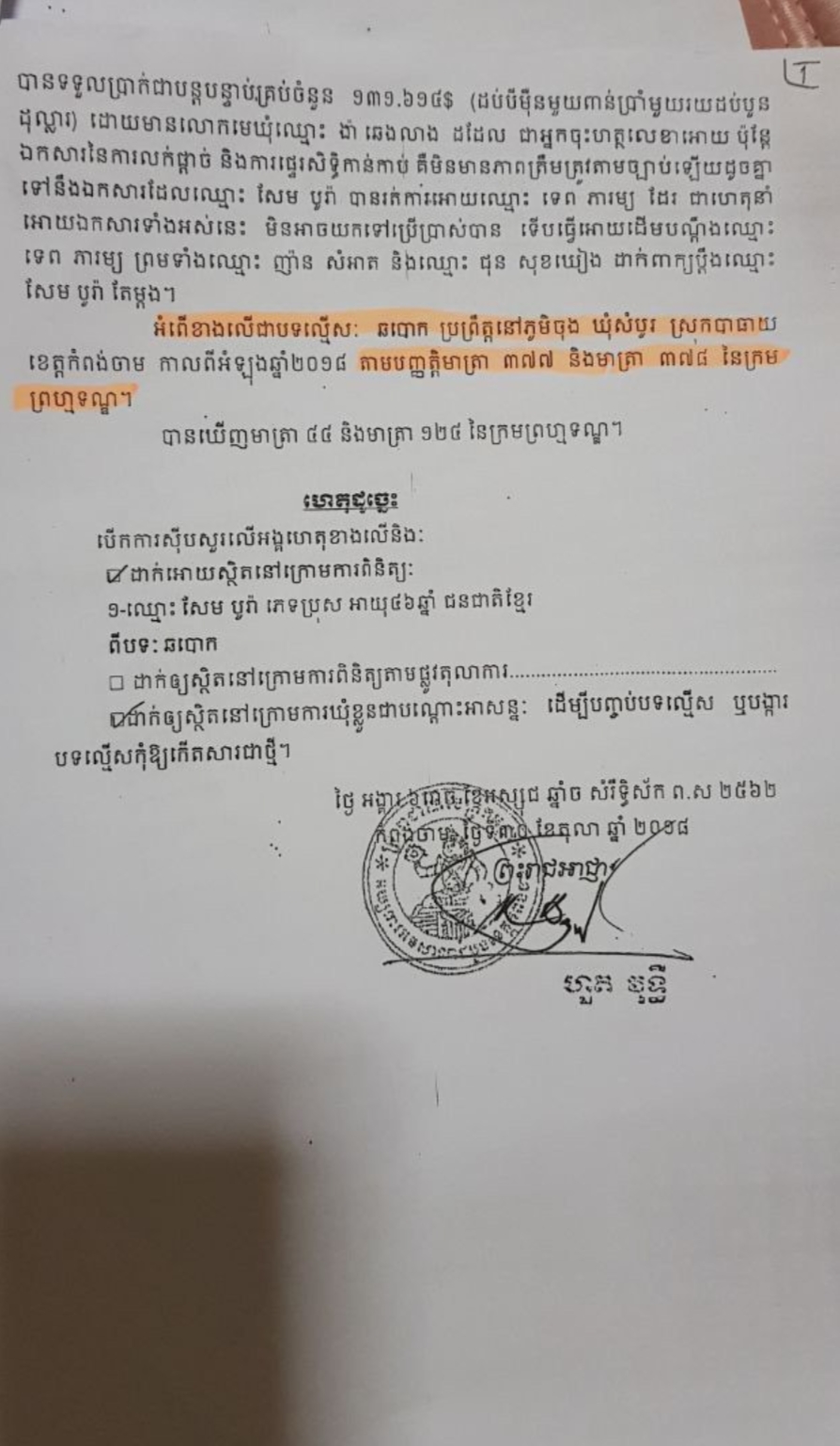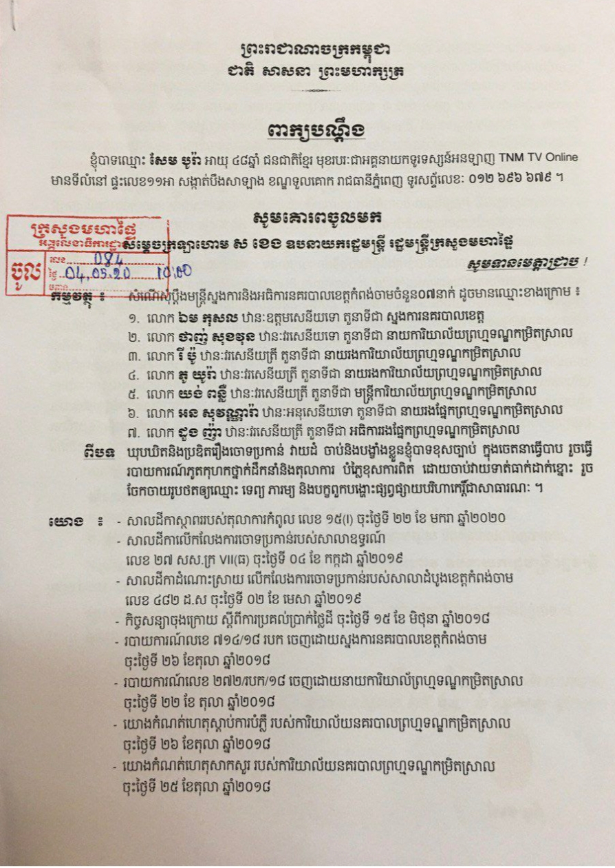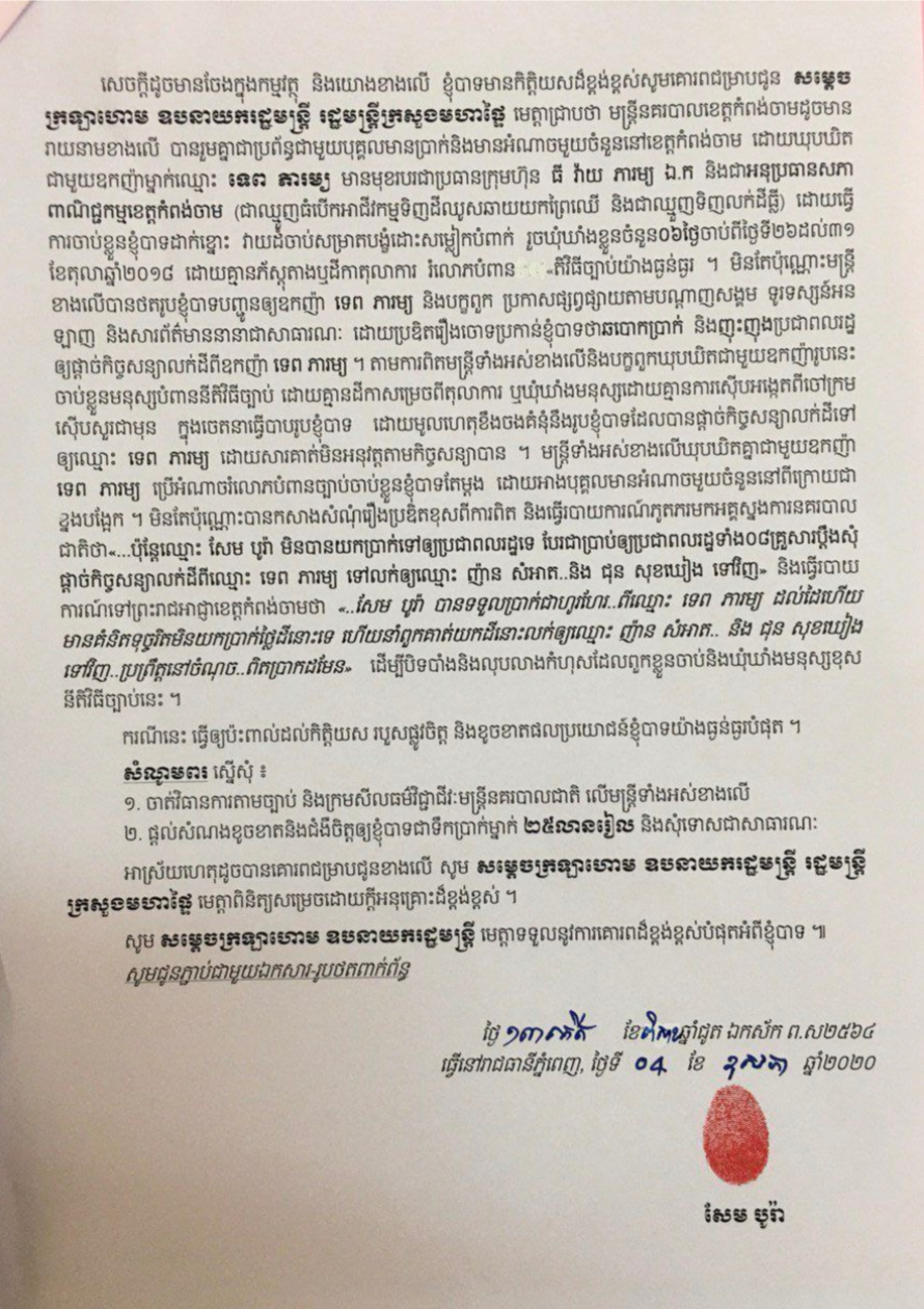 បានដាក់ពាក្យបណ្ដឹងប្ដឹងមន្ត្រីនគរបាលជាន់ខ្ពស់ខេត្តកំពង់ចាម ចំនួន៧រូប ទៅសម្ដេចក្រឡាហោម ស ខេង ឧបនាយករដ្ឋមន្ត្រី រដ្ឋមន្ត្រីក្រសួងមហាផ្ទៃ ឱ្យជួយរកយុត្តិធម៌ដល់ខ្លួន,,,!។