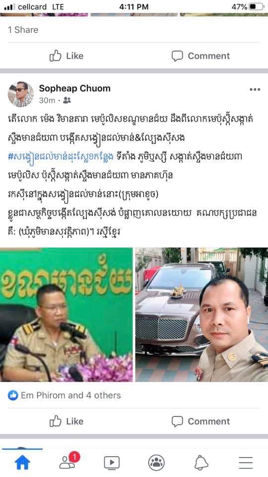 នាយប៉ុស្តិ៍ស្ទឹងមានជ័យ៣​ ច្រានចោលចំពោះហ្វេសប៊ុក​ឈ្មោះ​ “​Sopheap Chuom” ដែលបង្ហោះចោទប្រកាន់​ លាបពណ៌រូបលោកនិងថ្នាក់ដឹកនាំខណ្ឌមានជ័យ