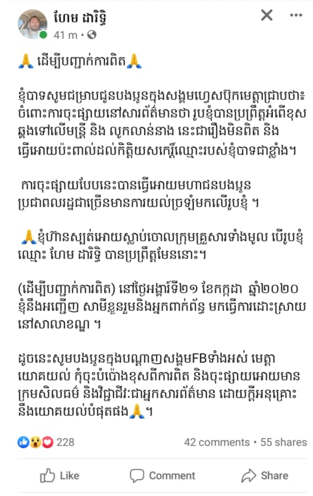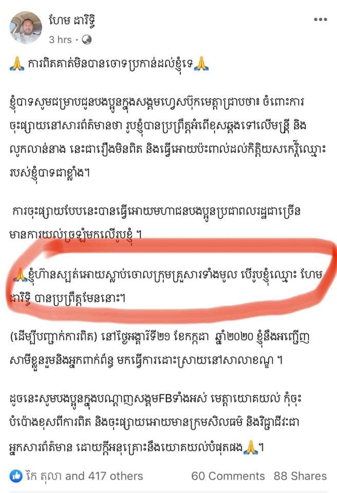 ក្រោយពីមានការចុះផ្សាយអំពីព័ត៌មានតាមសម្ដីក្នុងការឡាយខ្លះនិងព័ត៌មានដែនកញ្ញាទេព សុភក្រ្តា ផ្ដល់តាមប្រព័ន្ធតេឡាក្រាមខ្លះដូចការរៀបរាប់ដ៏សង្ខេបខាងលើនោះរួចមកស្រាប់តែនៅវេលាព្រឹកថ្ងៃទី១៨ ខែកក្កដា ឆ្នាំ២០២០ លោកហែម ដារិទ្ធិ អភិបាលខណ្ឌពោធិ៍សែនជ័យ ហាក់រសើបខ្នងនៅមិនសុខ ក៏បានសរសេរសារបង្ហោះនៅក្នុងបណ្ដាញសង្គមហ្វេសប៊ុករបស់ខ្លួនថា៖ ដើម្បីបញ្ជាក់ការពិត» «ខ្ញុំបាទសូមជម្រាបជូនបងប្អូនក្នុងសង្គមហ្វេសប៊ុកមេត្តាជ្រាបថា៖ ចំពោះការចុះផ្សាយនៅសារព័ត៌មានថា រូបខ្ញុំបានប្រព្រឹត្តអំពើខុសឆ្គងទៅលើមន្រ្តី និង លូកលាន់នាង នេះជារឿងមិនពិត និងធ្វើអោយប៉ះពាល់ដល់កិត្តិយសកេរ្តិ៍ឈ្មោះរបស់ខ្ញុំបាទជាខ្លាំង។ការចុះផ្សាយបែបនេះបានធ្វើអោយមហាជនបងប្អូនប្រជាពលរដ្ឋជាច្រើនមានការយល់ច្រឡំមកលើរូបខ្ញុំ ។ ខ្ញុំហ៊ានស្បត់អោយស្លាប់ចោលក្រុមគ្រួសារទាំងមូល បើរូបខ្ញុំឈ្មោះ ហែម ដារិទ្ធិ បានប្រព្រឹត្តមែននោះ។(ដើម្បីបញ្ជាក់ការពិត) នៅថ្ងៃអង្គារ៍ទី២១ ខែកក្កដា ឆ្នាំ២០២០ ខ្ញុំនឹងអញ្ជើញ សាមីខ្លួនរួមនិងអ្នកពាក់ព័ន្ធ មកធ្វើការដោះស្រាយនៅសាលាខណ្ឌ ។ដូចនេះសូមបងប្អូនក្នុងបណ្តាញសង្គមFBទាំងអស់ មេត្តាយោគយល់ កុំចុះបំប៉ោងខុសពីការពិត និងចុះផ្សាយអោយមានក្រមសិលធម៌ និងវិជ្ជាជីវៈជាអ្នកសារព័ត៌មាន ដោយក្តីអនុគ្រោះនឹងយោគយល់បំផុតផង?។