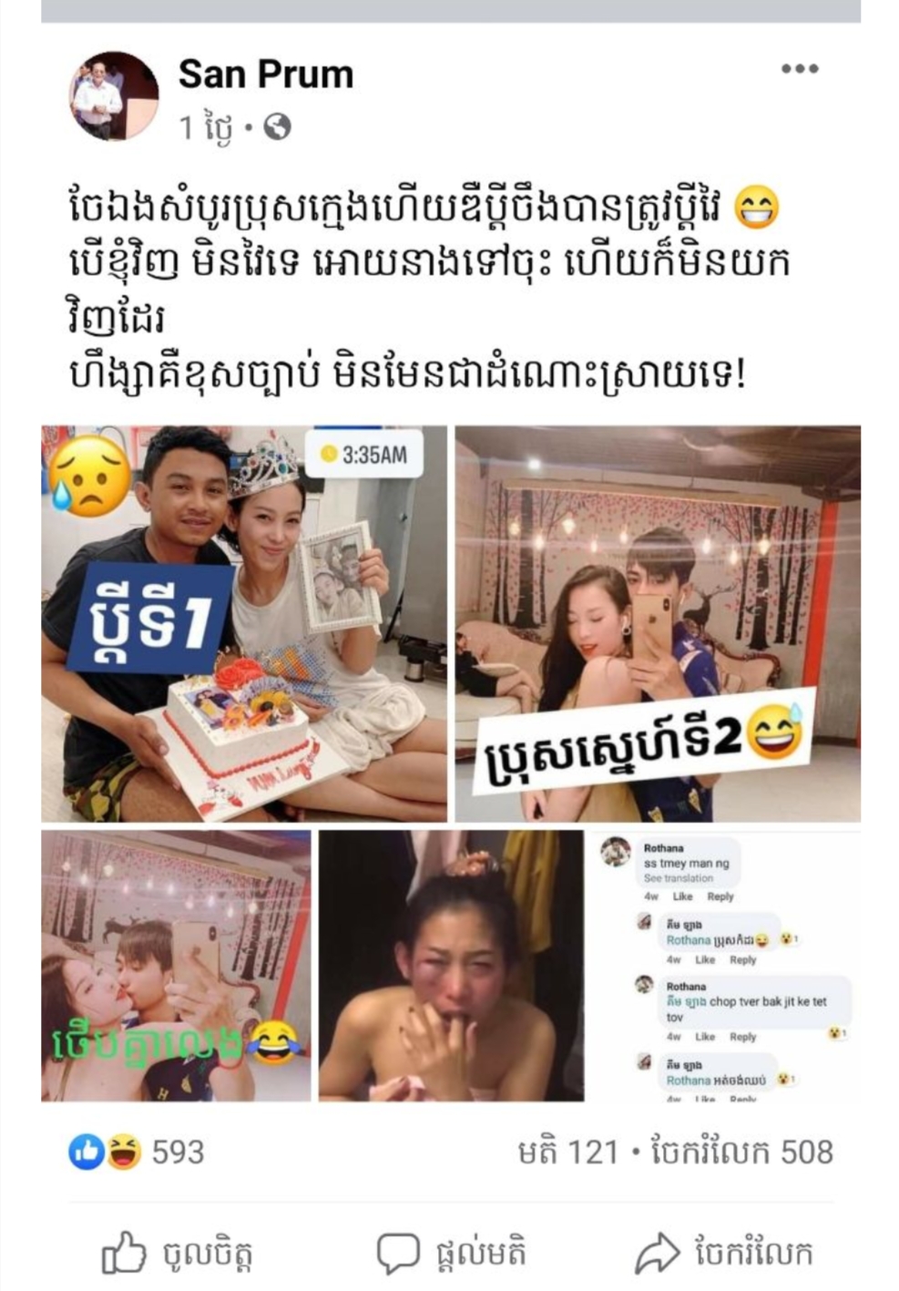 ហើយថ្មីៗនេះលោក ព្រំ សាន បានpost រឿងសង្សាវ៉ៃគ្នា ដោយខាងសរសេរថា៖ស្រីសំបូរប្រុសស្នេហ៍ជាដើម។ល។។