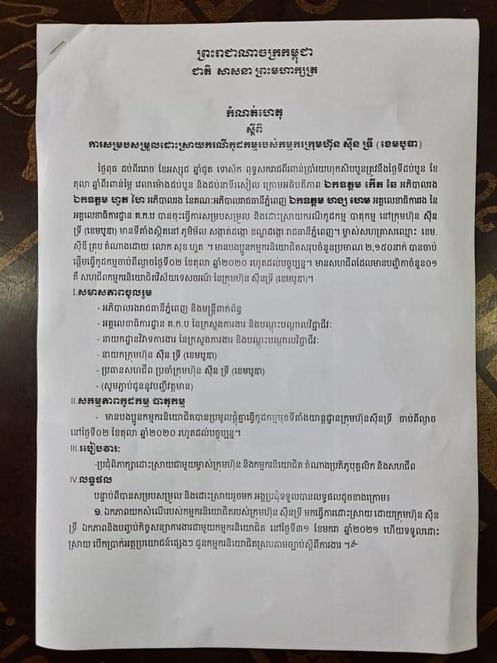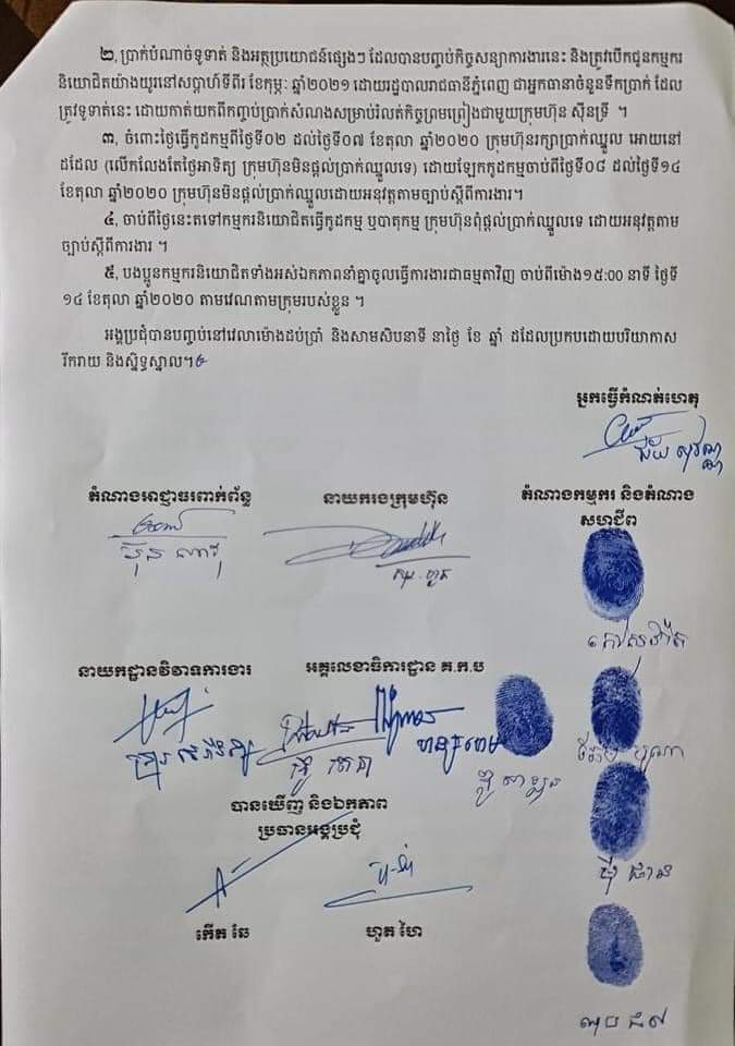 សូមរំលឹកថា ក្នុងអង្គប្រជុំរកដំណោះស្រាយ កាលពីថ្ងៃទី០៧ ខែតុលា ឆ្នាំ២០២០ គ្រប់ភាគីទាំងអស់ ពិសេសកម្មករក្រុមហ៊ុន ស៉ីនទ្រី បានព្រមព្រៀងម្តងរួចមកហើយ ប៉ុន្តែនៅថ្ងៃបន្ទាប់មិនទាន់ ចូលធ្វើការទើបតែនៅពេលនេះ បានព្រមព្រៀងចូលធ្វើការវិញហើយចាប់ពីរសៀលថ្ងៃទី១៤ ខែតុលា ឆ្នាំ២០២០នេះ៕