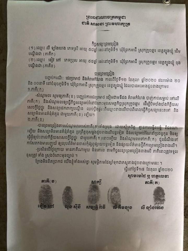 ត្បូងឃ្មុំ៖ រឿងលោក ខៀវ ពៅ មេប៉ុស្តិ៍ឃុំក្រូចឆ្មារ ស្រុកក្រូចឆ្មារ ខេត្តត្បូងឃ្មុំ ជេរប្រមាថ គំរាមកំហែង ចង់បាញ់សម្លាប់ ប្រជាពលរដ្ឋ ដែលរស់នៅជាប់របងផ្ទះជាមួយនោះ​ អាចបញ្ចប់ដោយត្រឹមលោក ខៀវ ពៅ ជាមេប៉ុស្តិ៍ ទទួលសុំទោសជនរងគ្រោះ នឹងព្រមធ្វើកិច្ចសន្យា មិនអោយមានជាលើកទីពីរ​ចប់រឿង​ តេីទង្វេីបែបនេះជាគំរូ​ សម្រាប់មន្រ្ដីនគរបាលខេត្តត្បូងឃ្មុំ។ ត្រូវ​យកគំរូតាមរឺ? ។