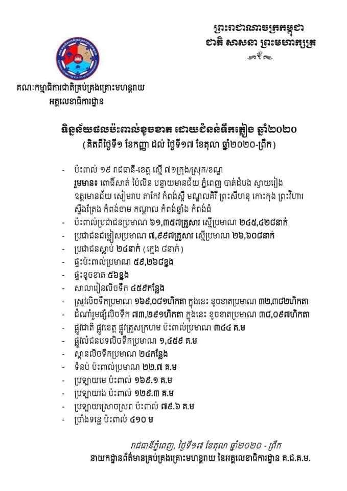ភ្នំពេញ៖ គណៈកម្មាធិការជាតិគ្រប់គ្រងគ្រោះមហន្តរាយបានឲ្យដឹងថាគិតដល់ថ្ងៃទី១៧ តុលា ឆ្នាំ២០២០ មានអ្នកបាត់បង់ជីវិតដោយសារជំនន់ទឹកភ្លៀងកើនដល់២៤នាក់ហើយ ក្នុងចំណោមខេត្តចំនួន៦ ។