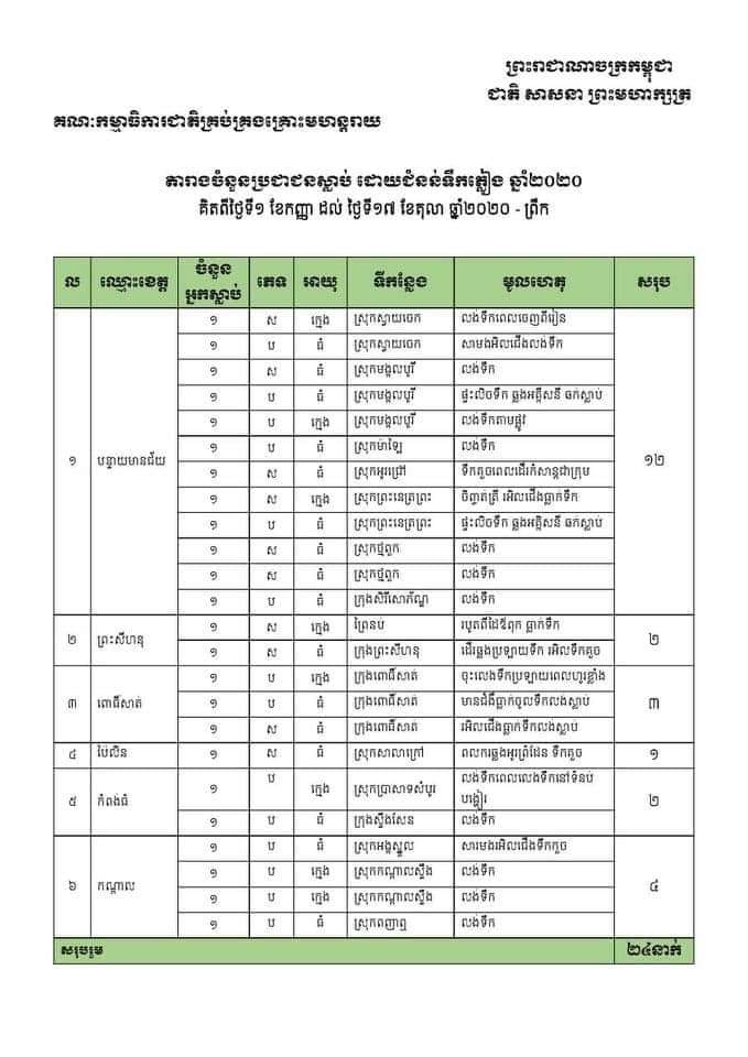 ភ្នំពេញ៖ គណៈកម្មាធិការជាតិគ្រប់គ្រងគ្រោះមហន្តរាយបានឲ្យដឹងថាគិតដល់ថ្ងៃទី១៧ តុលា ឆ្នាំ២០២០ មានអ្នកបាត់បង់ជីវិតដោយសារជំនន់ទឹកភ្លៀងកើនដល់២៤នាក់ហើយ ក្នុងចំណោមខេត្តចំនួន៦ ។