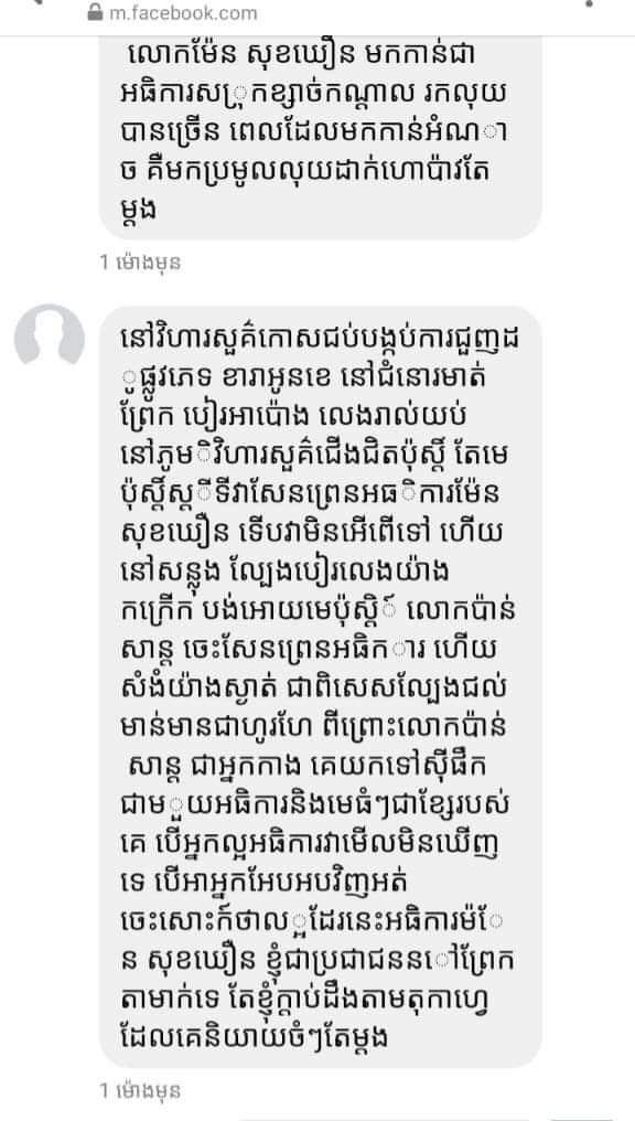 ប្រភពសារពីបងប្អូនប្រជាពលរដ្ឋលួចបង្ហើបប្រាប់ម្ចាស់ទន្លេមេគង្គថា៖ នៅឃុំវិហារសួគ៌មានកន្លែងកោសជប់បង្កប់ការជួញដូផ្លូវភេទ ខារាអូនខេ នៅជំនោរមាត់ព្រែក បៀរអាប៉ោង លេងរាល់យប់នៅភូមិវិហារសួគ៌ជើងជិតប៉ុស្តិ៍ តែមេប៉ុស្តិ៍ស្ដីទីទំនងសែនព្រេនអធិការម៉ែន សុខឃឿន ទើបមិនអើពើទៅ ហើយនៅសន្លុង ល្បែងបៀរលេងយ៉ាងកក្រើក ទំនងបង់អោយមេប៉ុស្តិ៍ លោកប៉ាន់ សាន្ត សែនព្រេនអធិការ ហើយសំងំយ៉ាងស្ងាត់ ជាពិសេសល្បែងជល់មាន់មានជាហូរហែ ពីព្រោះលោកប៉ាន់ សាន្ត ជាអ្នកកាង គេយកទៅសុីផឹកជាមួយអធិការនិងមេធំៗជាខ្សែរបស់គេ បើអ្នកល្អអធិការ មើលមិនឃើញទេ បើអាអ្នកអែបអបវិញអត់ចេះសោះក៍ថាល្អដែរនេះអធិការម៉ែន សុខឃឿន ខ្ញុំជាប្រជាជននៅព្រែកតាមាក់ទេ តែខ្ញុំក្ដាប់ដឹងតាមតុកាហ្វេដែលគេនិយាយចំៗតែម្ដង។
