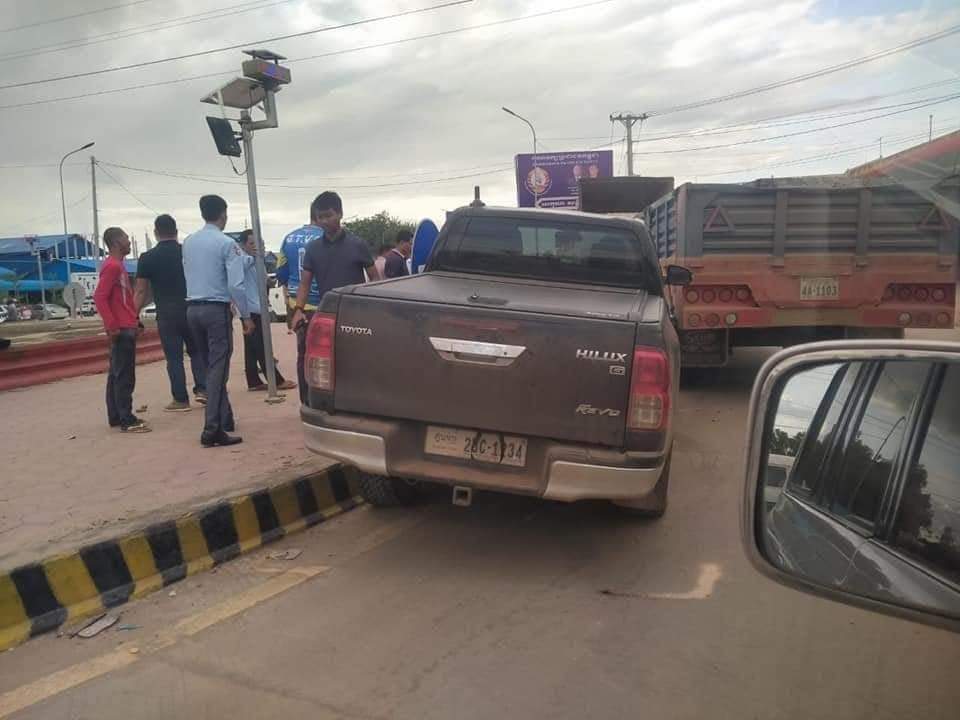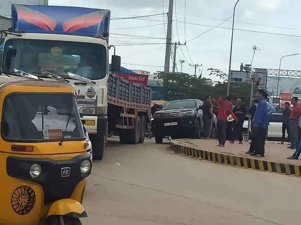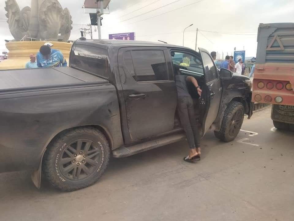 រថយន្ដសណ្តោងរ៉ឺម៉កបត់រង្វង់មូលមិនប្រយ័ត្ន បានគាបរថយន្តvigoឡើងរង្វង់មូលព្រែកតាម៉ាក់