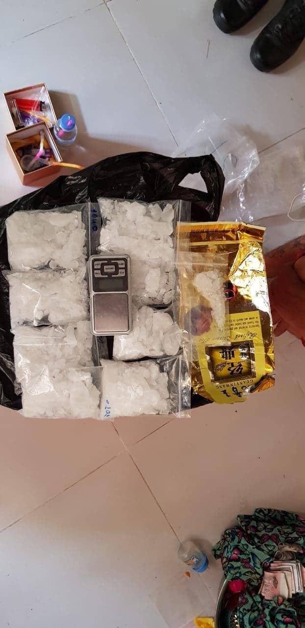 ជញ្ជីងអេឡិចត្រូនិច០១ សំបកថង់ពណ៌លឿង០១ កូនថង់ប្លាស្ទិចមួយចំនួនឧបករណ៍សំរាប់ប្រើប្រាស់គ្រឿងញៀនមួយចំនួន ទូរស័ព្ទដៃចំនួន០២គ្រឿងម៉ូតូ០១គ្រឿងម៉ាកវ៉េវ ពណ៌ខ្មៅ ពាក់ស្លាកលេខ ភ្នំពេញ 1BC 1241។