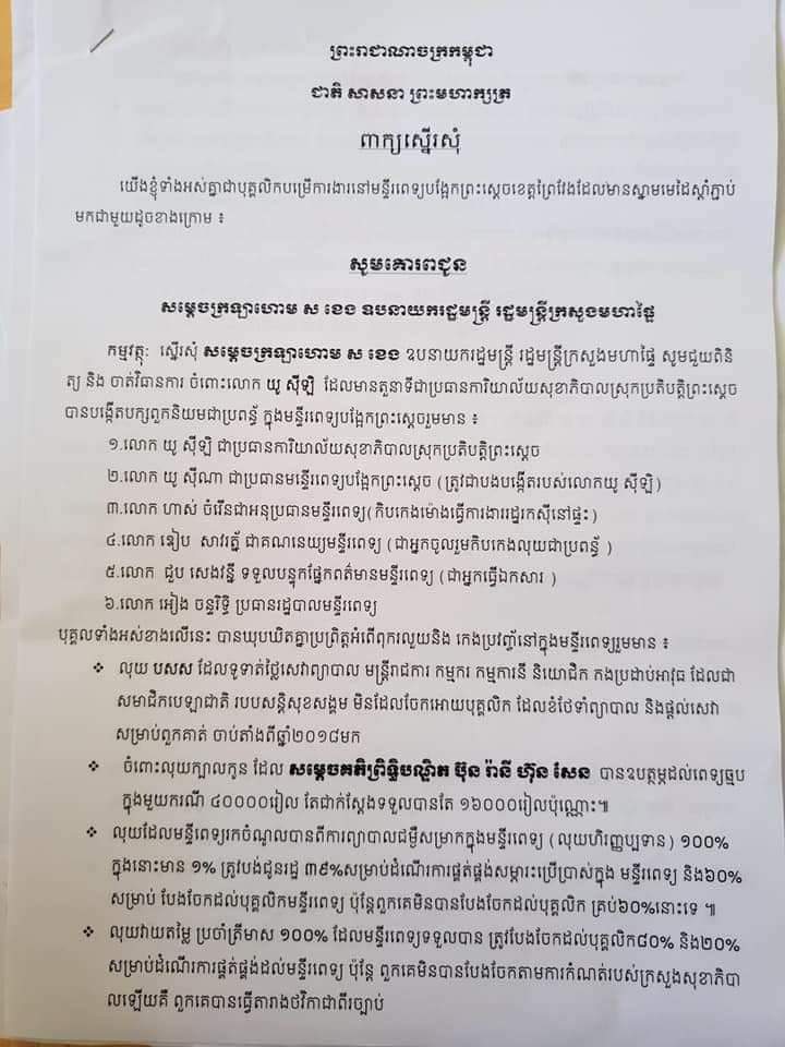 ដើម្បីឱ្យចាត់វិធានការ ចំពោះលោក យូ ស៊ីឡិ ដែលបានដឹកនាំ ប្រកាន់បក្ខពួកគ្រួសារនិយម ប្រព្រឹត្តអំពើពុករលួយ គាបយកលុយពីអ្នកជំងឺ និងស៊ីដាច់លុយ របបការងារកូនចៅជាដើម។ល។