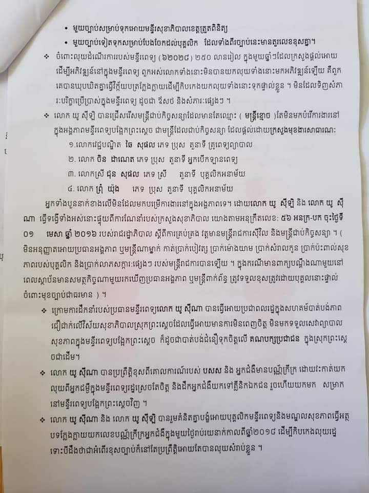 លិខិតនោះបានបញ្ជាក់ទៀតថា៖ អ្នកទាំង៦នាក់ខាងលើ បានឃុបឃិតគ្នាប្រព្រឹត្តអំពើពុករលួយធ្ងន់ធ្ងរ និងកេងប្រវ័ញ្ចលុយក្នុងមន្ទីរពេទ្យ។