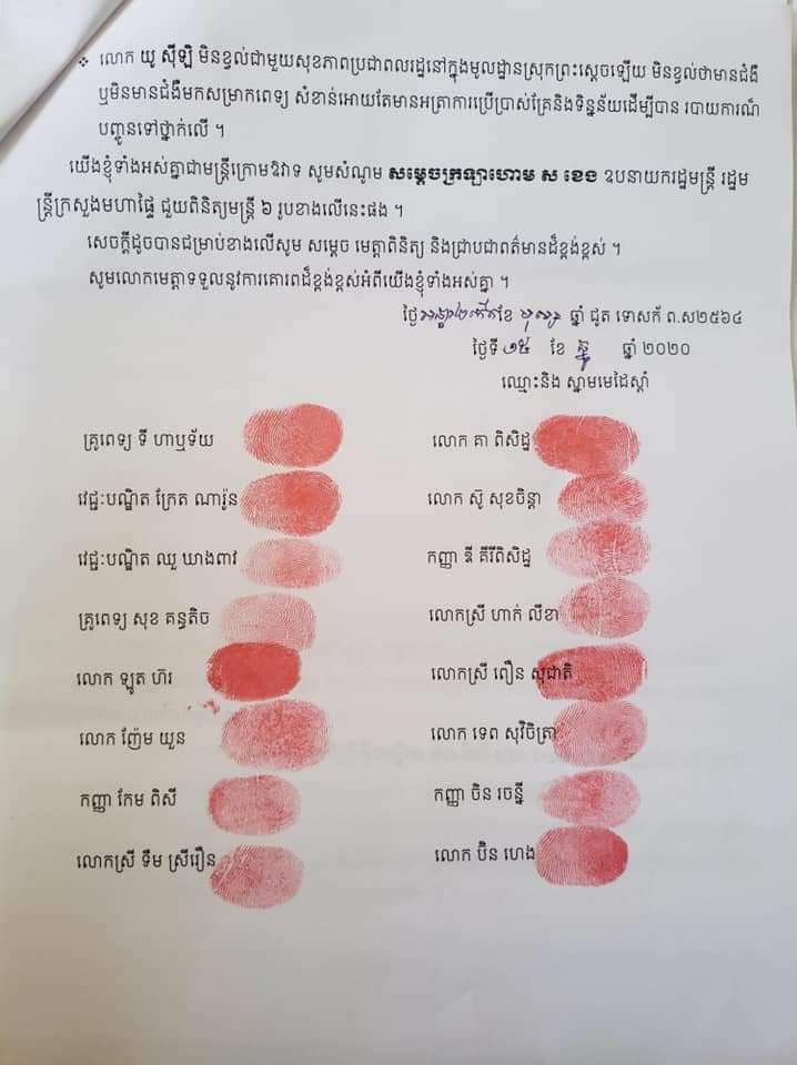 ដោយមានភ្ជាប់ស្នាមមេដៃមន្ត្រីពេទ្យបង្អែកស្រុកព្រះស្ដេច ចំនួន១៦នាក់ ដែល«ដើមរាំង»ទើបទទួលបាននៅថ្ងៃទី១៧.១២.២០២០ បានឱ្យដឹងថា៖ក្រុមគ្រូពេទ្យបានស្នើសុំឱ្យសម្ដេចក្រហោម ស ខេង ជួយពិនិត្យនិងចាត់វិធានការចំពោះលោក យូ ស៊ីឡិ ជាប្រធានការិយាល័យសុខាភិបាលស្រុកប្រតិបត្តិព្រះស្ដេច ។