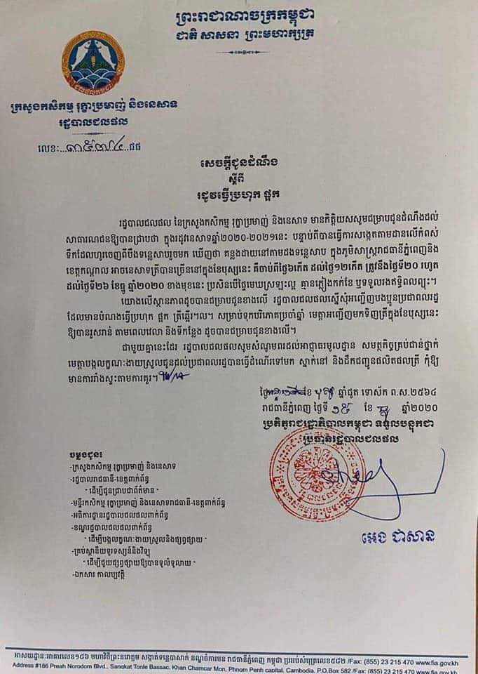 ក្នុងសេចក្តីជូនដំណឹង ដែលចុះហត្ថលេខា ដោយលោក អេង ជាសាន ប្រតិភូរាជរដ្ឋាភិបាល ទទួលបន្ទុកជា ប្រធានរដ្ឋបាលជលផល បានស្នើសុំអញ្ជើញបងប្អូន ប្រជាពលរដ្ឋ ដែលមានបំណងធ្វើ ប្រហុក ផ្អក ត្រីឆ្អើរ ។ល។ សម្រាប់ទុកបរិភោគប្រចាំឆ្នាំ មេត្តាអញ្ជើញមកទិញត្រី ក្នុងខែបុស្សនេះ ឱ្យបានរួសរាន់ តាមពេលវេលា និងទីកន្លែង ដូចបានជម្រាបជូនខាងលើ៕ដោយ៖សហការី