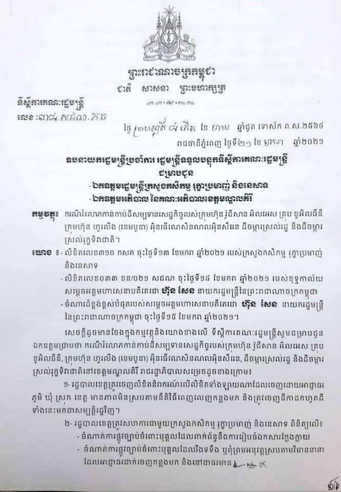 សេចក្តីសម្រេចនេះត្រូវបានបង្ហាញនៅក្នុងលិខិតណែនាំមួយទៅកាន់រដ្ឋមន្ត្រីក្រសួងកសិកម្ម រុក្ខាប្រមាញ់ និងនេសាទ និងអភិបាលខេត្តមណ្ឌលគិរី នៅថ្ងៃទី២១ ខែមករា ឆ្នា២០២១នេះ។