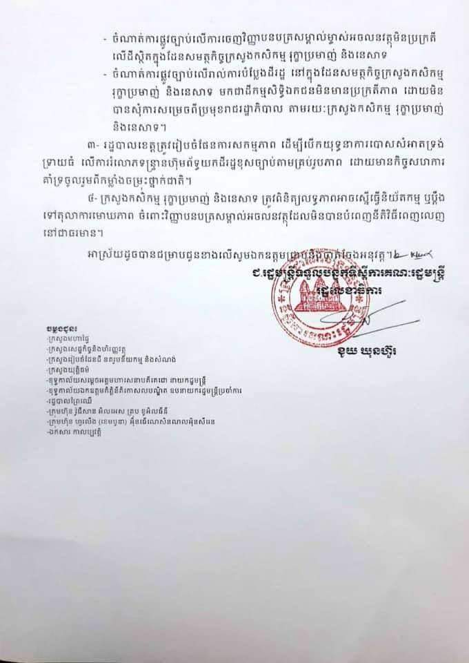 ទីស្តីការគណៈរដ្ឋមន្ត្រី ក៏បានសម្រេចឱ្យក្រសួងកសិកម្ម រុក្ខាប្រមាញ់ និងនេសាទ ត្រូវពិនិត្យលទ្ធភាពអាចស្នើធ្វើនិយ័តកម្ម ឬប្តឹងទៅតុលាការមោឃភាព ចំពោះវិញ្ញាបនបត្រសម្គាល់អចលនវត្ថុដែលមិនបានបំពេញនីតិវិធីពេញលេញនៅជាធរមាន។