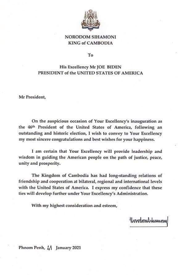 (ភ្នំពេញ)៖ ព្រះករុណា ព្រះបាទ សម្តេច ព្រះបរមនាថ នរោត្តម សីហមុនី ព្រះមហាក្សត្រនៃកម្ពុជា ព្រះអង្គបានព្រះរាជទានព្រះរាជសារអបអរសាទរជូនចំពោះលោក ចូ បៃដិន (Joe Biden) ដែលបានក្លាយជាប្រធានាធិបតីសហរដ្ឋអាមេរិកទី៤៦ នៅថ្ងៃទី២០ ខែមករា ឆ្នាំ២០២១។