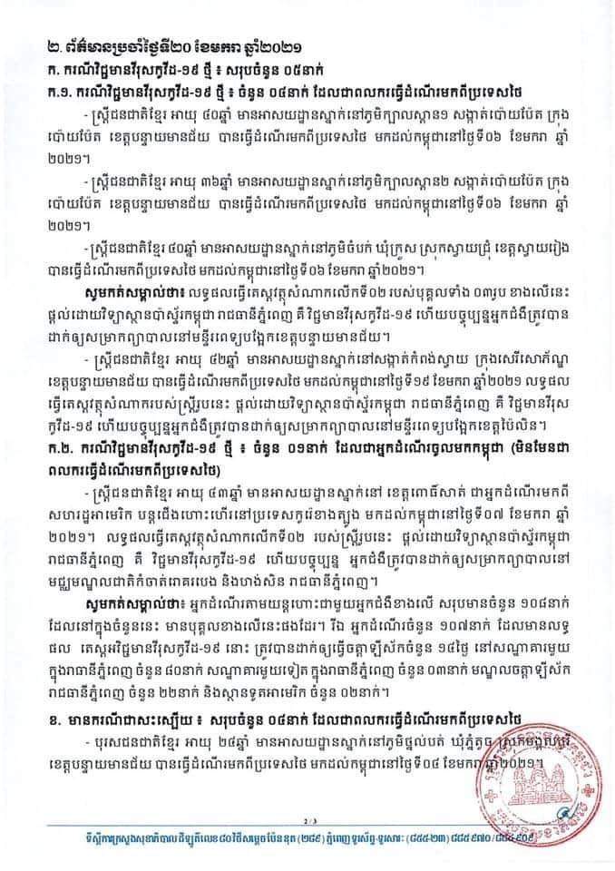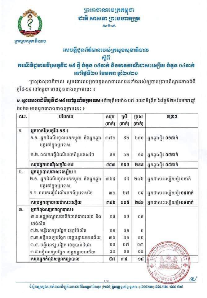 (ភ្នំពេញ)៖ ក្រសួងសុខាភិបាល នៅព្រឹកថ្ងៃទី២១.០១.២០២១ បានចេញសេចក្តីប្រកាសព័ត៌មាន អំពីលទ្ធផល កាលពីថ្ងៃទី២០.០១.២០២១។