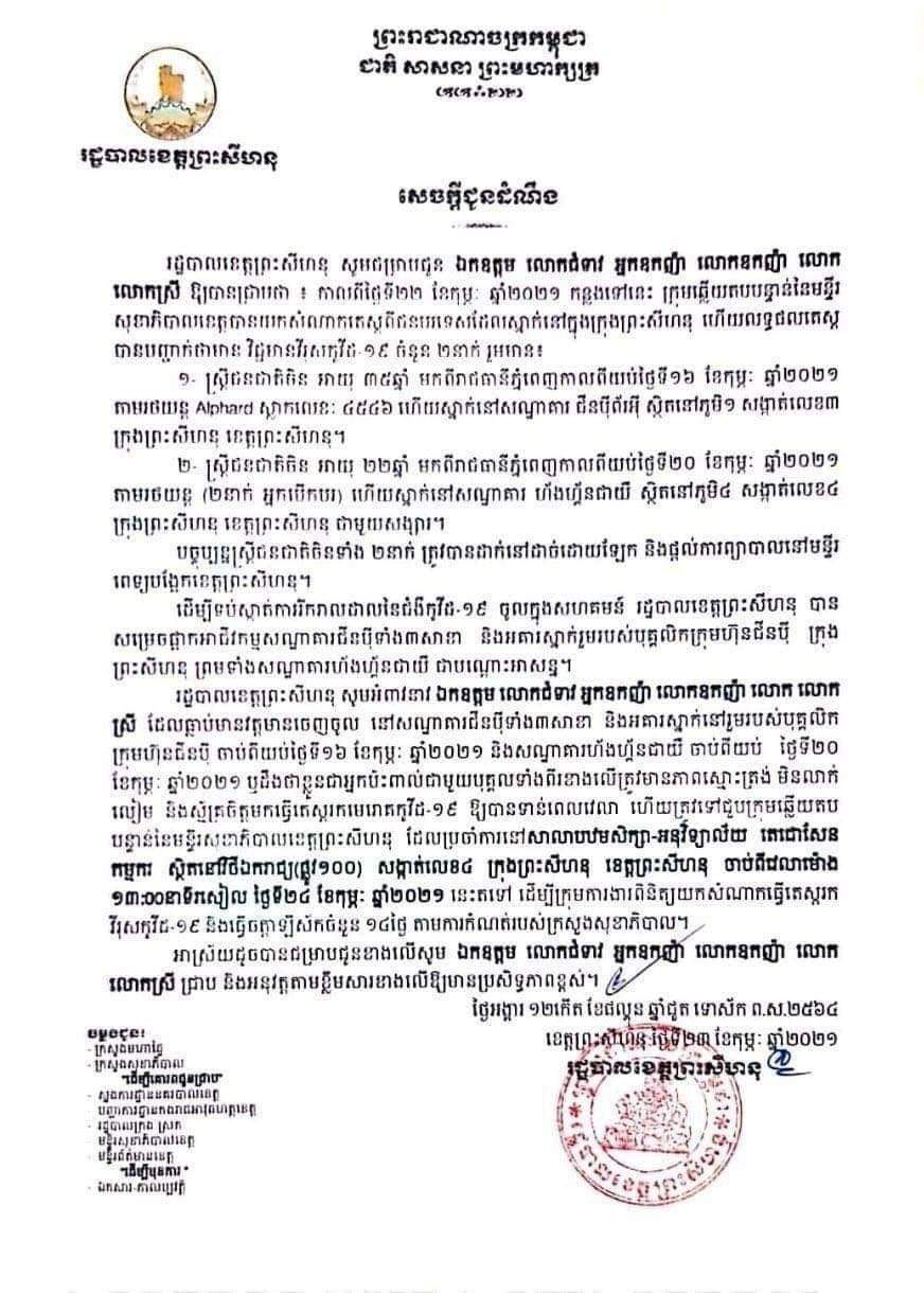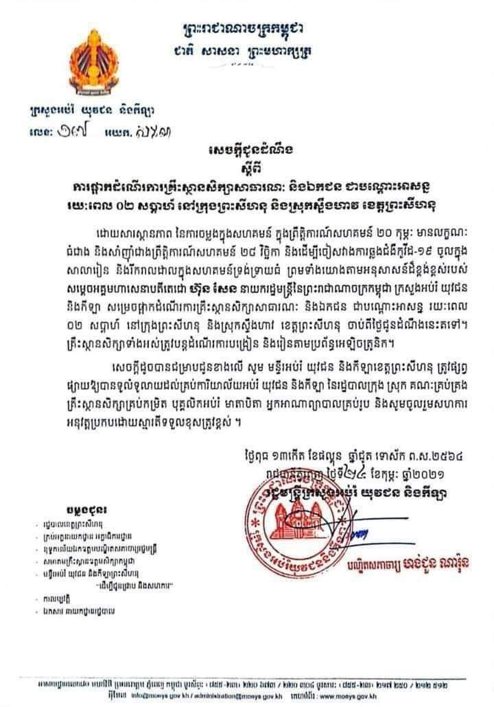 ខេត្តព្រះសីហនុ៖ យោងតាម សេចក្តីជួនដំណឹងរបស់ ក្រសួង អប់រំយុវជននិងកីឡា លេខ១៧(អយក) ចុះថ្ងៃទី ២៤ ខែ កុម្ភៈ ឆ្នាំ ២០២១ បានបញ្ជាក់ថាក្រសួងបានសម្រេចផ្អាកដំណើរការគ្រឹះស្ថានសិក្សាសាធារណៈ និងឯក ជន ជាបណ្តោះអាសន្នរយៈពេល ២ សប្តាហ៍ នៅក្រុងព្រះសីហនុ និងស្រុកស្ទឹងហាវ ខេត្តព្រះសីហនុដោយសារ ស្ថានភាព នៃការចម្លងក្នុងសហគមន៍ ក្នុងព្រឹត្តិការណ៍សហគមន៍ ២០ កុម្ភៈ មានលក្ខណៈធំជាង និងសាំញ៉ាំជាង ព្រឹត្តិការណ៍សហគមន៍ ២៨ វិច្ឆិកា និងដើម្បីចៀសវាងការឆ្លងជំងឺកូវីដ-១៩ ចូលក្នុងសាលារៀន និងរីករាលដាល ក្នុងសហគមន៍ទ្រង់ទ្រាយធំ ព្រមទាំងយោងតាមអនុសាសន៍ដ៏ខ្ពង់ខ្ពស់របស់សម្តេចអគ្គមហាសេនាបតីតេជោ ហ៊ុន សែន នាយករដ្ឋមន្ត្រីនៃព្រះរាជាណាចក្រកម្ពុជា។