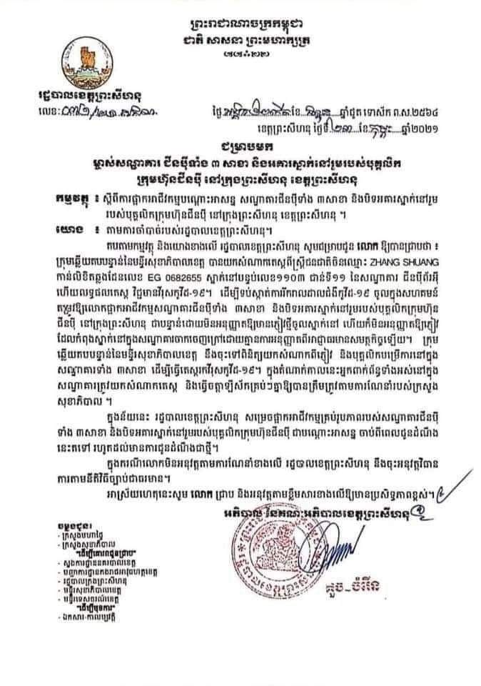 ក្រសួងអប់រំសម្រេច ក្រកាស់បិទសាលារៀន នៅលើទឹកដីខេត្តព្រះសីហនុ បែបនេះគឺធ្វើឡើង ក្រោយ ពេលរដ្ឋបាលខេត្តព្រះសីហនុរកឃើញស្រ្តីជនជាតិចិនចំនួន២នាក់វិជ្ជមានកូវិដ១៩និងបានចេញសេចក្តីជួនដំណឹងផ្អាក អាជីវកម្មបណ្ដោះអាសន្នសណ្ឋាគារ ជីនប៉ីទាំង ៣សាខានិងអគារស្នាក់នៅរួមរបស់បុគ្គលិកក្រុមហ៊ុនជីនប៉ី នៅក្រុងព្រះសីហនុ ខេត្តព្រះសីហនុរូមនិង សណ្ឋាគារ ហ័ងហ្គឹនជាវី ដែលមានការពាក់ព័ន្ធ។