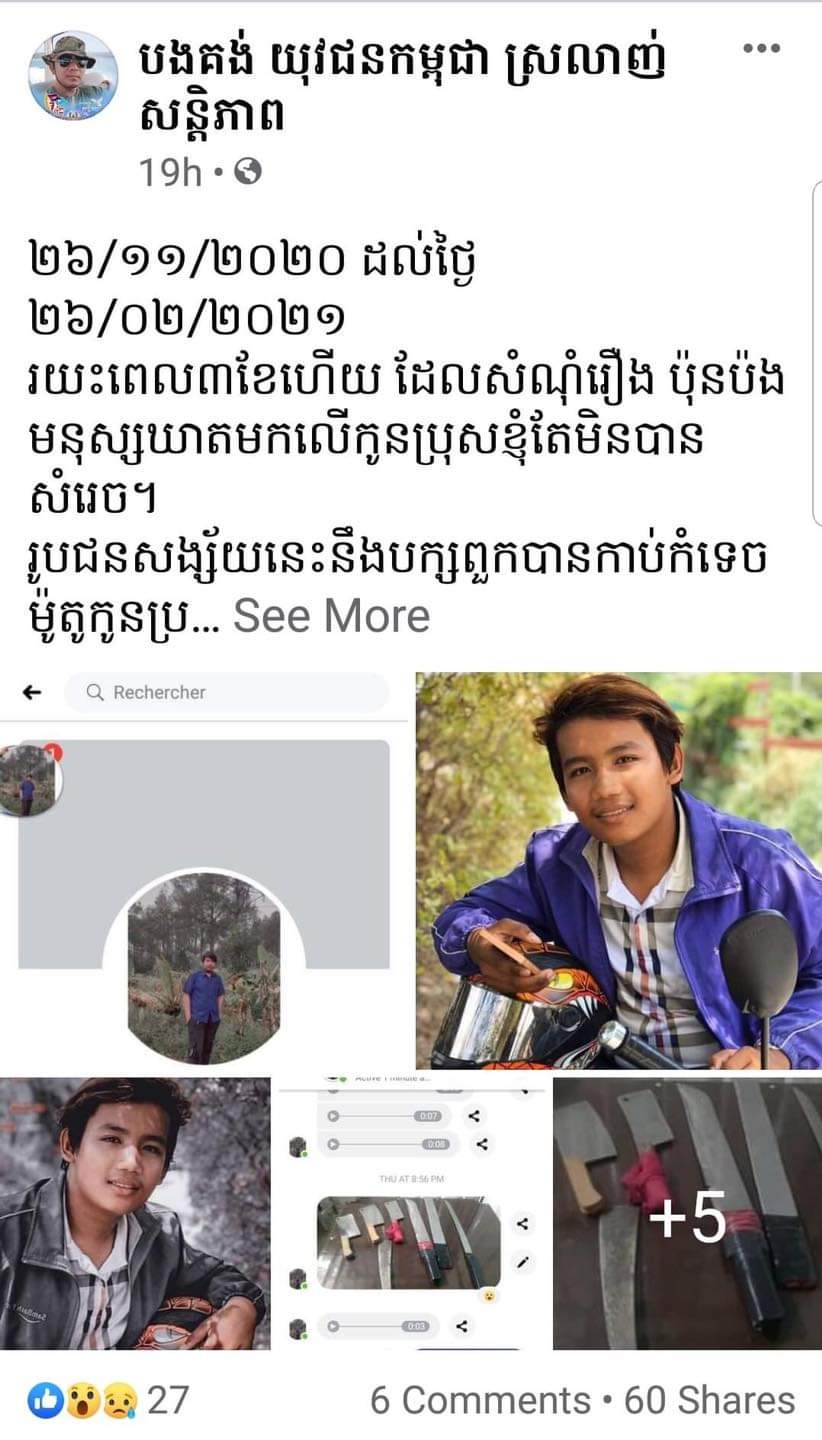 (ភ្នំពេញ)៖ គិតចាប់ពីថ្ងៃទី២៦/១១/២០២០ ដល់ថ្ងៃ ២៦/០២/២០២១មានរយះពេល៣ខែហើយ ដែលសំណុំរឿង ប៉ុនប៉ងមនុស្សឃាតមកលើកូនប្រុសខ្ញុំតែមិនបានសំរេច។