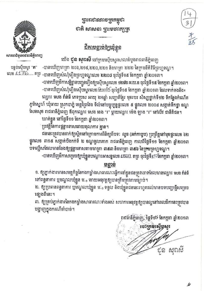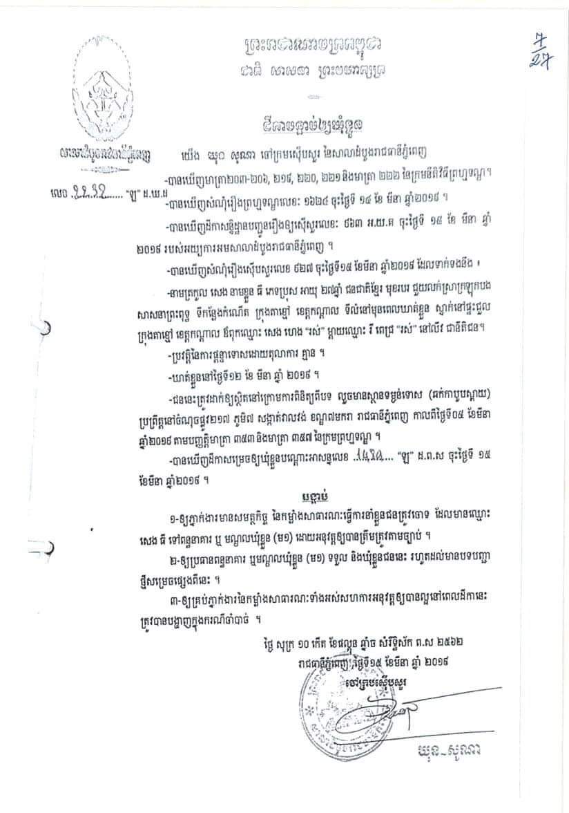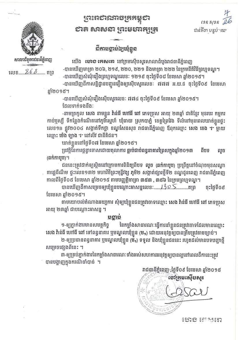 ជនសង្ស័យឈ្មោះ សេង វ៉ាន់ធី ហៅ ធីហើម ភេទ ប្រុស អាយុ ៣១ ឆ្នាំ ជនជាតិ ខ្មែរ មុខរបរ មិនពិតប្រាកដមានទីលំនៅផ្ទះលេខអា០៦ ផ្លូវបេតុង ភូមិថ្មី សង្កាត់ដង្កោ ខណ្ឌដង្កោ រាជធានីភ្នំពេញ ។