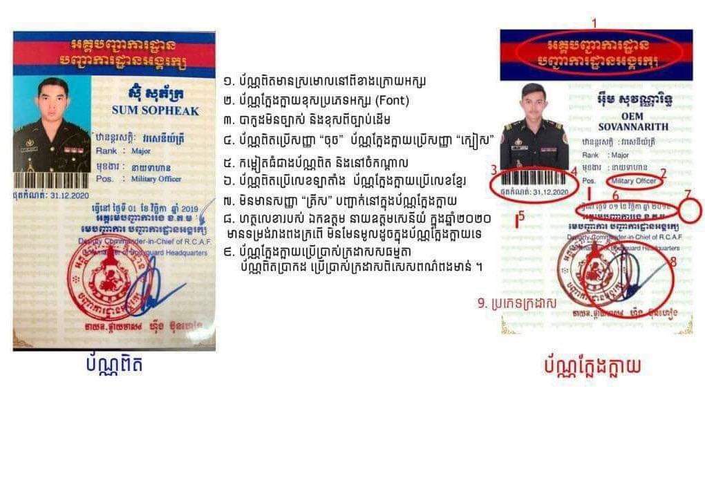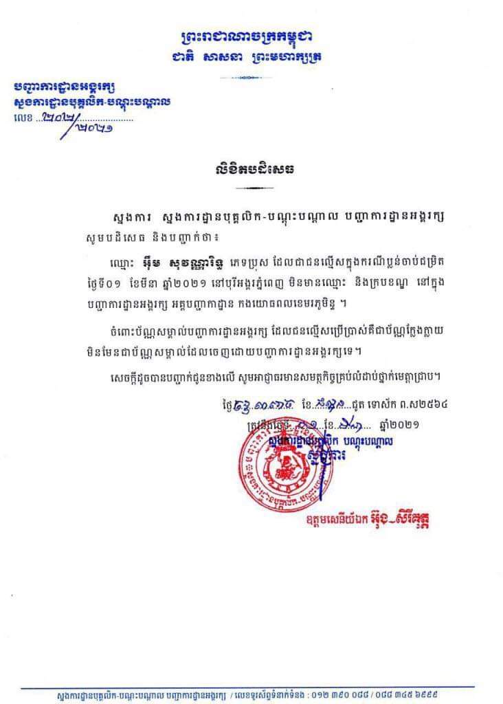 លិខិតបដិសេធរបស់ស្នងការដ្ឋានបុគ្គល-បណ្ដុះបណ្ដាល នៃបញ្ជាការដ្ឋានអង្គរក្ស ដែលបណ្ដាញព័ត៌មាន ទទួលបានអះអាងថា ឈ្មោះ អ៉ឹម សុវណ្ណារិទ្ធ មិនមានឈ្មោះ និងក្របខណ្ឌក្នុងបញ្ជាការដ្ឋានអង្គរក្សនោះឡើយ ហើយប័ណ្ណសម្គាល់ខ្លួនដែលបានចែកចាយនោះ ជាប័ណ្ណសម្គាល់ខ្លួនក្លែងក្លាយ មិនមែនប័ណ្ណដែលចេញដោយបញ្ជាការដ្ឋានអង្គរក្សនោះទេ។