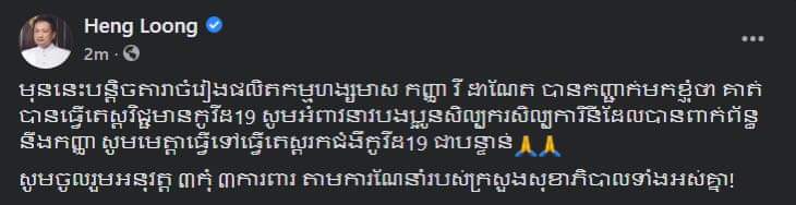 ភ្នំពេញ៖«មុននេះបន្តិច តារាចំរៀងផលិតកម្មហង្សមាស កញ្ញា វី ដាណែត បានបញ្ជាក់មកខ្ញុំ ថា គាត់បានធ្វើតេស្ត «វិជ្ជមានកូវីដ-១៩» សូមអំពាវនាវបងប្អូនសិល្បករ សិល្បការិនី ដែលបានពាក់ព័ន្ធនឹងកញ្ញា សូមមេត្តាធ្វើទៅធ្វើតេស្តរកជំងឺកូវីដ-១៩ជាបន្ទាន់» ។