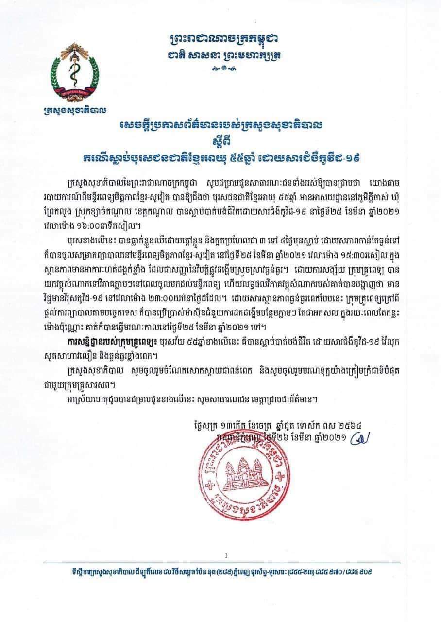 (ភ្នំពេញ)៖ នៅថ្ងៃទី២៦.០៣.២០២១នេះក្រសួងសុខាភិបាល បានចេញសេចក្ដីប្រកាសព័ត៌មានជាផ្លូវការ៖។
