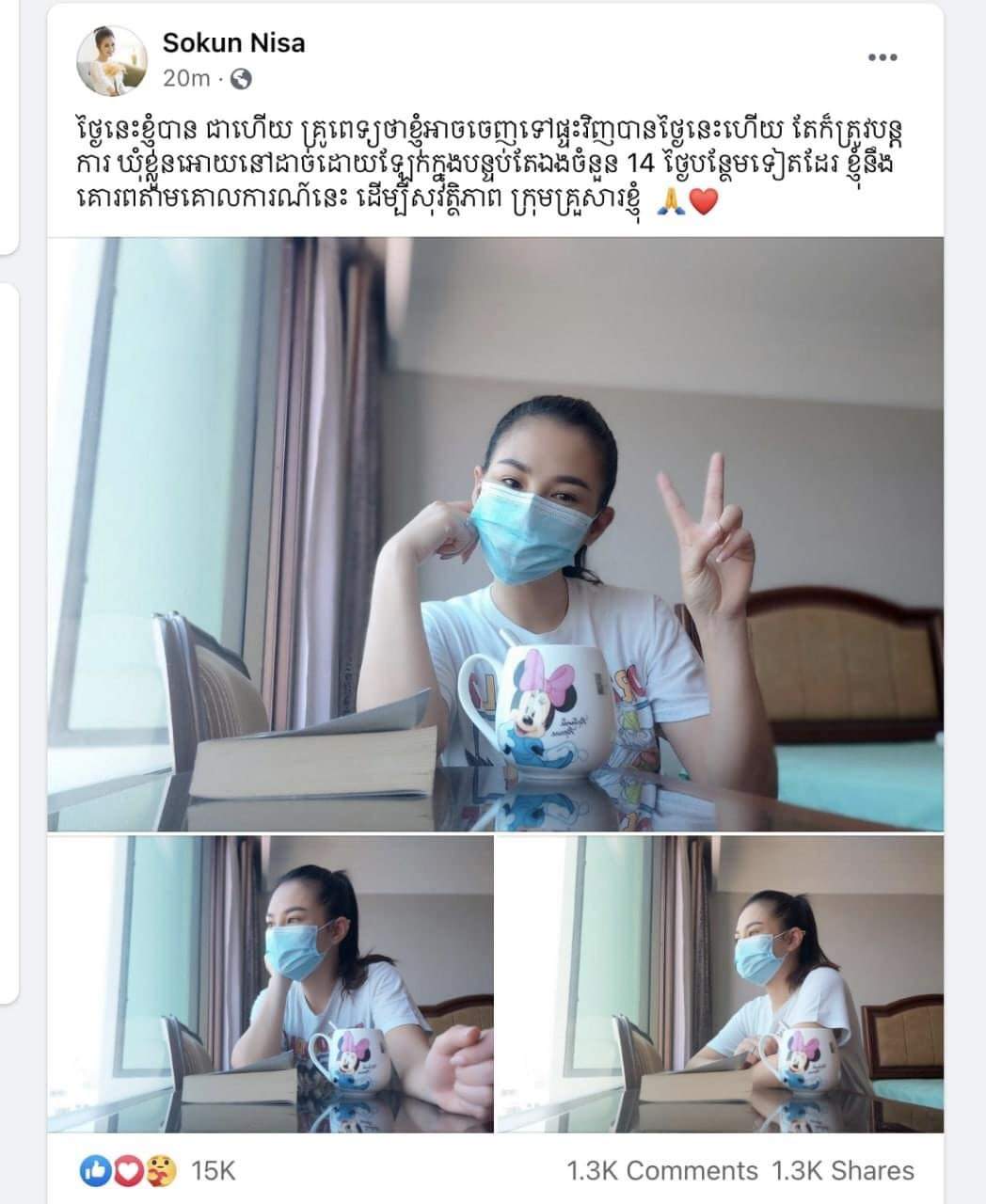 ឡែកក្នុងបន្ទប់តែឯងចំនួន 14 ថ្ងៃបន្ថែមទៀតដែរ ខ្ញុំនឹង គោរពតាមគោលការណ៍នេះ ដេីម្បីសុវត្ថិភាព.ក្រុមគ្រួសារខ្ញុំ»