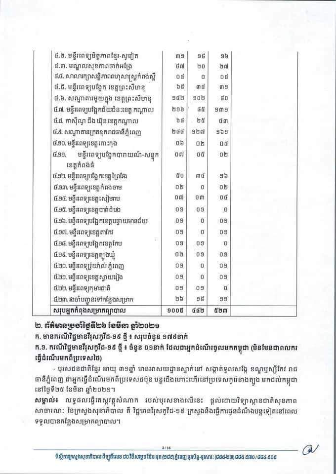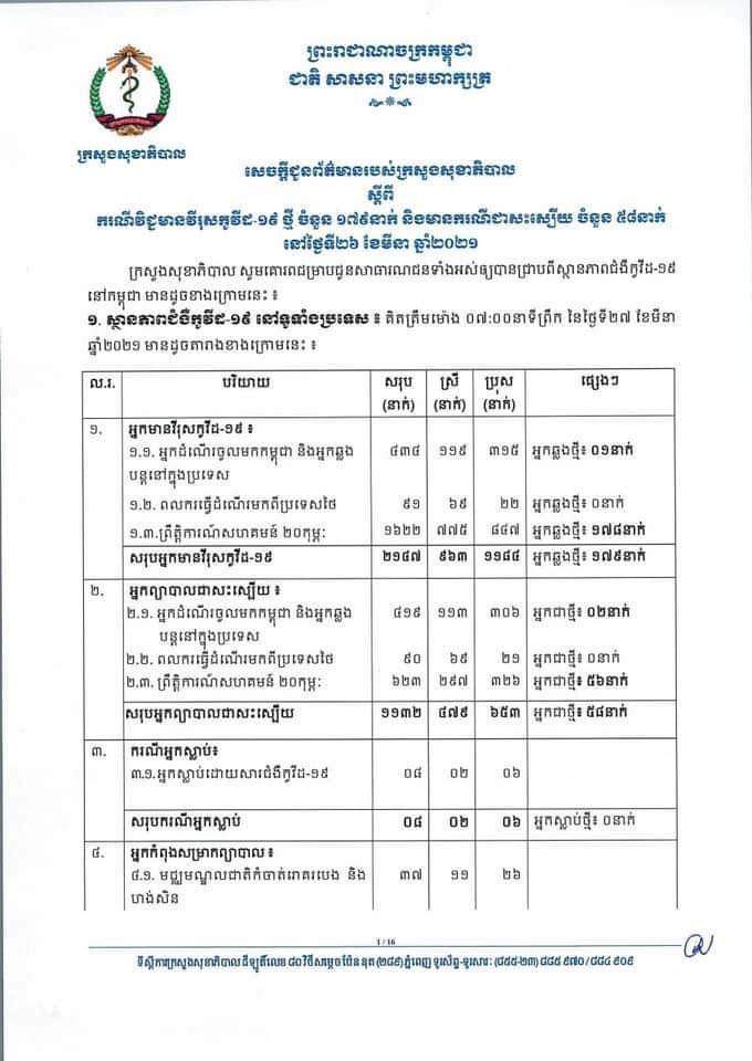 សូមជម្រាបថា៖ គិតត្រឹមព្រឹក ថ្ងៃទី២៧ ខែមីនា ឆ្នាំ២០២១ កម្ពុជា រកឃើញអ្នកឆ្លងកូវីដ១៩សរុបចំនួន២.១៤៧នាក់។