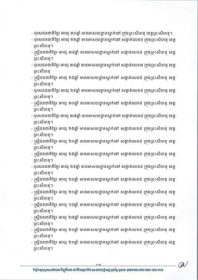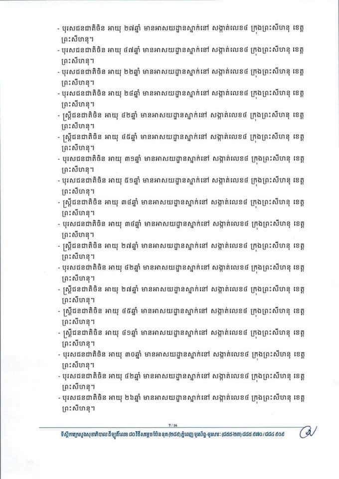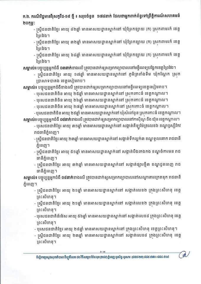 នៅក្នុងចំណោមអ្នកឆ្លងកូវីដ១៩ថ្មីសរុបទាំង១៧៨នាក់ មាននៅតាមខេត្តក្រុងមួយចំនួនដូចជា៖ ព្រះសីហនុ១៤៣នាក់ ភ្នំពេញ២៦ កណ្ដាល៤នាក់ ព្រៃវែង៣នាក់ សៀមរាប១នាក់ និងកំពង់ចាម១នាក់ ផងដែរ។