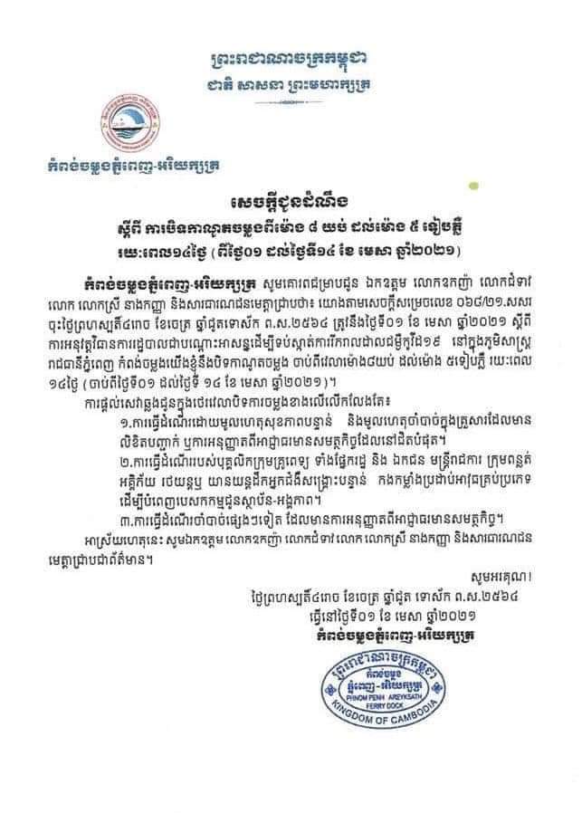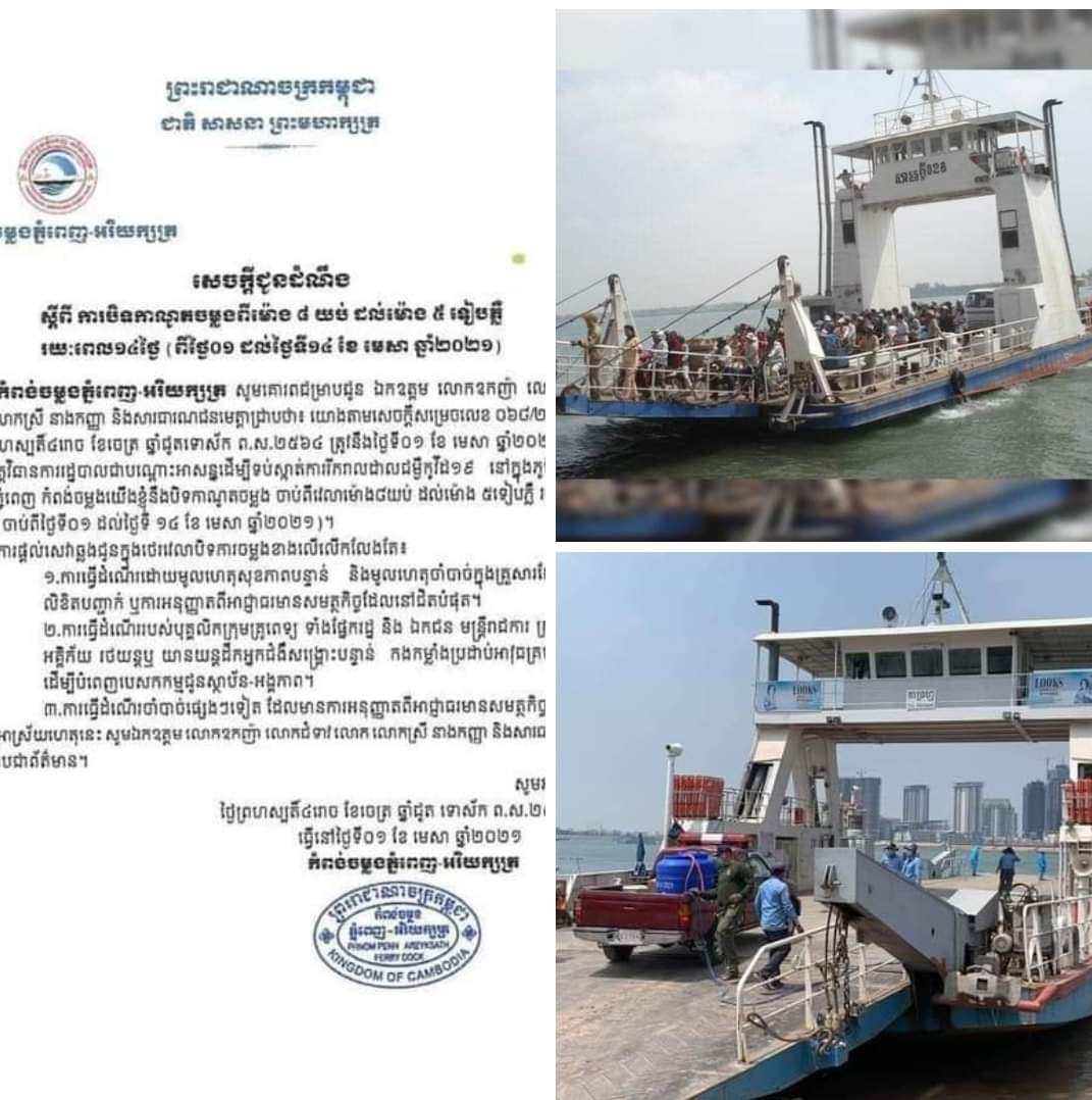 កំពង់ចម្លងភ្នំពេញ-អរិយក្សត្រ សូមគោរពជម្រាបជូន លោកឧកញ៉ា លោក លោកស្រី នាងកញ្ញា និងសាធារណជនមេត្តាជ្រាបថា៖ យោងតាមសេចក្តីសម្រេចលេខ ០៦៨/២១.សសរ ចុះថ្ងៃព្រហស្បតិ៍៤រោច ខែចេត្រ ឆ្នាំជូតទោស័ក ព.ស.២៥៦៤ ត្រូវនឹងថ្ងៃទី០១ ខែ មេសា ឆ្នាំ២០២១ ស្តីពី ការអនុវត្តវិធានការរដ្ឋបាលជាបណ្តោះអាសន្នដើម្បីទប់ស្កាត់ការរីករាលដាលជម្ងឺកូវីដ-១៩ នៅក្នុងភូមិសាស្ត្រ រាជធានីភ្នំពេញ កំពង់ចម្លងយើងខ្ញុំនឹងបិទកាណូតចម្លង ចាប់ពីវេលាម៉ោង៨យប់ ដល់ម៉ោង ៥ទៀបភ្លឺ រយៈពេល ១៤ថ្ងៃ (ចាប់ពីថ្ងៃទី០១ ដល់ថ្ងៃទី ១៤ ខែ មេសា ឆ្នាំ២០២១)។
