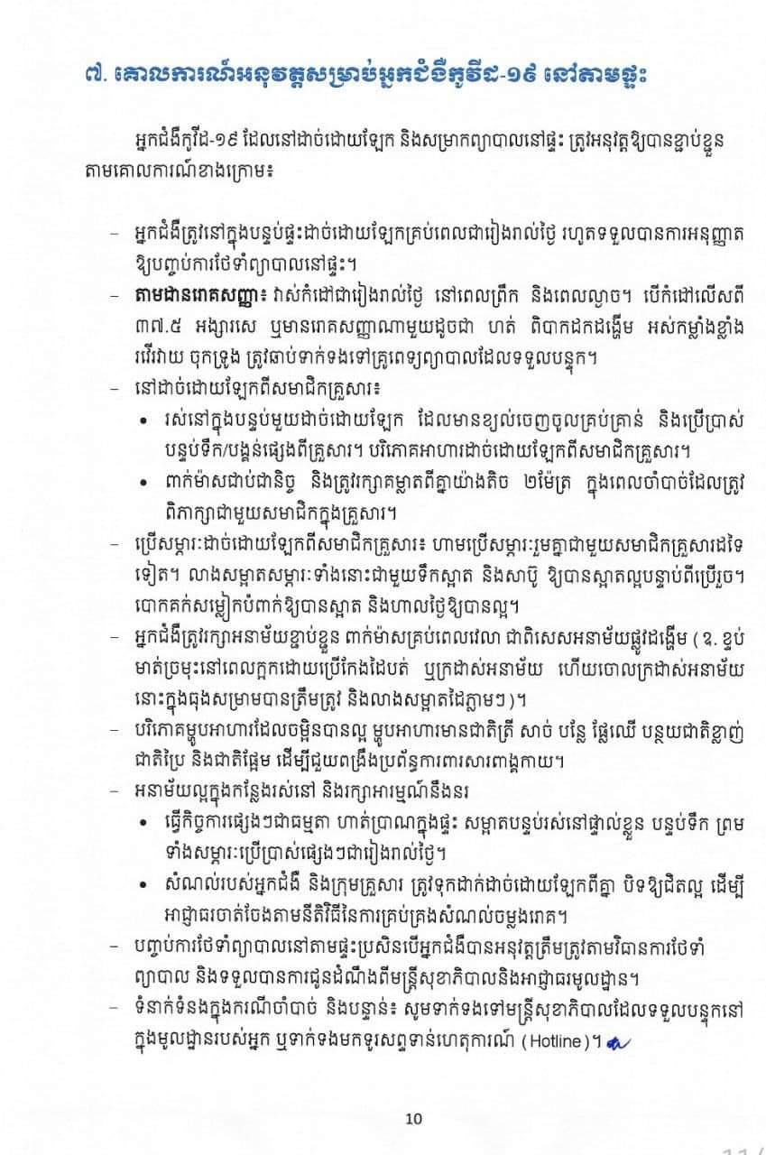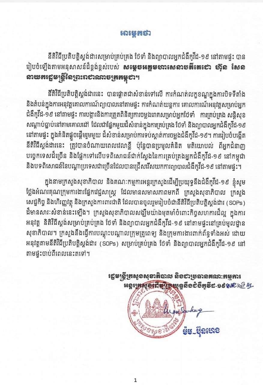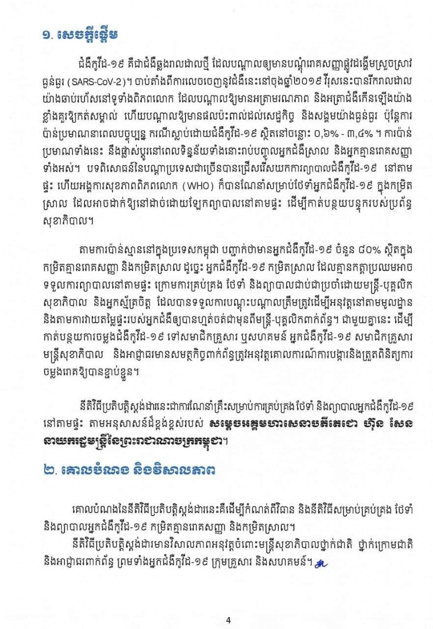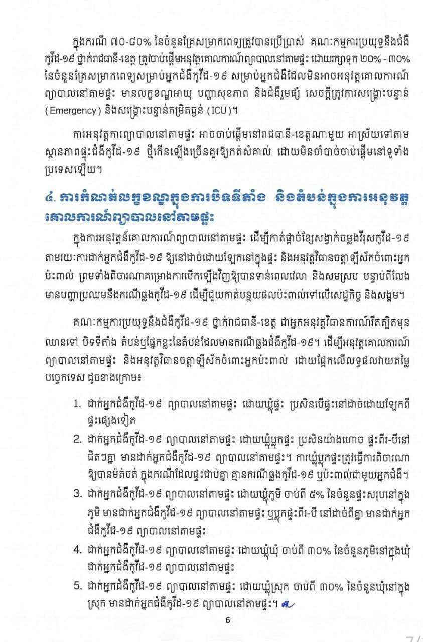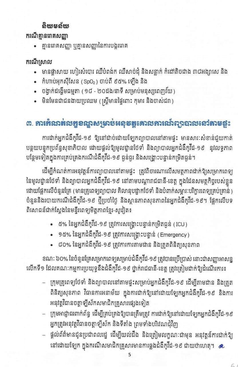 សូមជម្រាបថា៖ ការព្យាបាលអ្នកជំងឺកូវីដ១៩នៅតាមផ្ទះ គឺសម្រាប់តែអ្នកជំងឺស្រាលប៉ុណ្ណោះ។