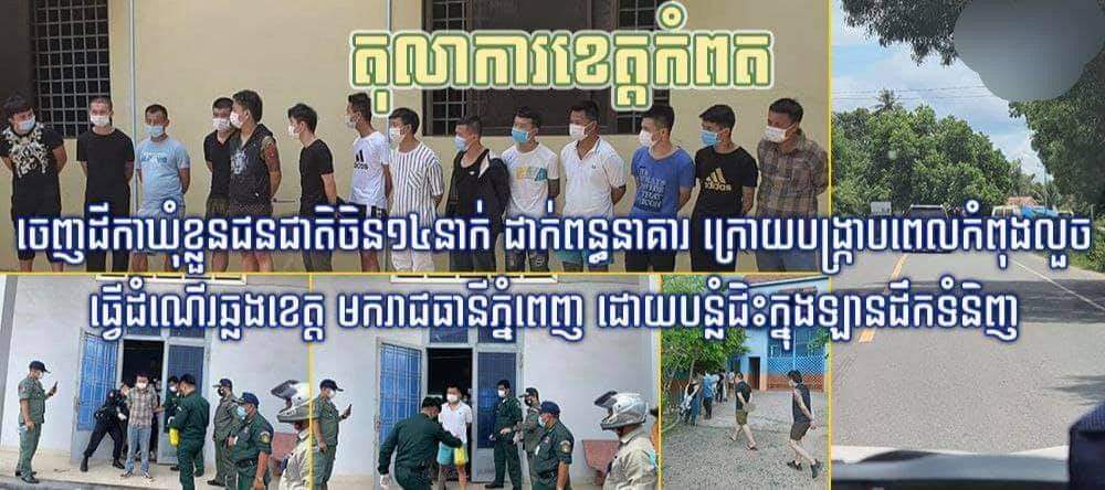 កំពត ៖ តុលាការខេត្តកំពត នៅថ្ងៃទី២២ ខែមេសា ឆ្នាំ២០២១នេះ បានចេញដីកាឃុំខ្លួនជនជាតិចិន ចំនួន១៤នាក់ ដាក់ពន្ធនាគារ ក្រោយកម្លាំងនគរបាលបង្ក្រាបបាន ពេលកំពុងលួចឆ្លងដែនពីខេត្តកំពត មករាជធានីភ្នំពេញ ដោយបន្លំជិះនៅក្នុងរថយន្តដឹកទំនិញ។