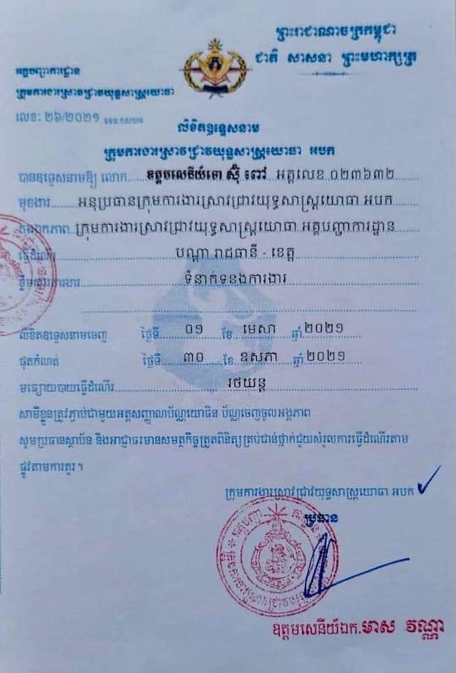 ឧត្តមសេនីយ៍ទោ ស៊ុ ពៅ បានទទួលលិខិតបេសកកម្មមួយសន្លឹក ដែលចេញដោយឧត្តមសេនីយ៍ឯក មាស វណ្ណា ប្រធានក្រុមការងារស្រាវជ្រាវយុទ្ធសាស្ដ្រយោធា អនុញ្ញាតឲ្យធ្វើដំណើរតាមរាជធានី-ខេត្ត ចាប់ពីថ្ងៃទី០១ ខែមេសា រហូតដល់ថ្ងៃទីផុតកំណត់ទី៣០ ខែឧសភា ឆ្នាំ២០២១។