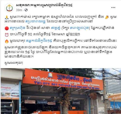 ភ្នំពេញ៖អនុគណៈកម្មការស្រាវជ្រាវជំងឺកូវីដ-១៩ នៅរសៀលថ្ងៃទី២២ ខែមេសា ឆ្នាំ២០២១ នេះ បង្ហាញថា មានអ្នកជំងឺកូវីដ-១៩ ម្នាក់ ជាបុគ្គលិកធ្វើការ នៅក្នុងក្រុមហ៊ុន វីរៈ ប៊ុនថាំ សាខាវត្តភ្នំ ក្បែរពេទ្យជប៉ុន ផ្នែកបញ្ញើឥវ៉ាន់ បានឆ្លងជំងឺកូវីដ-១៩ ។