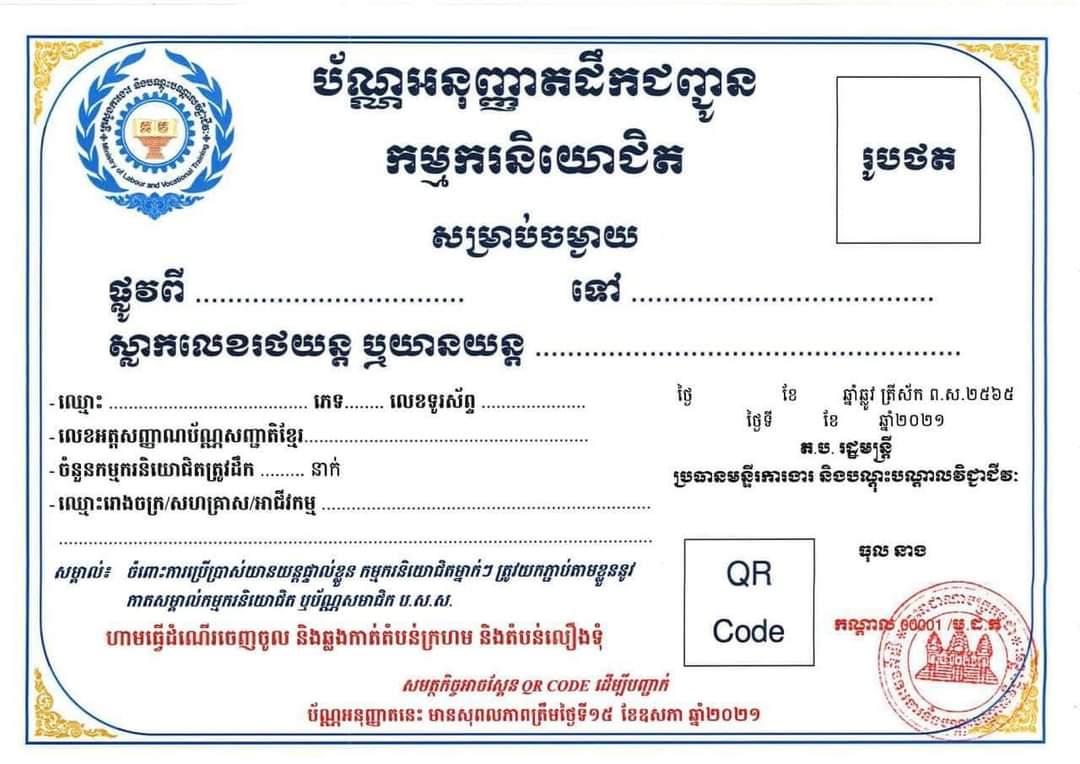 សេចក្តីជូនដំណឹង នៅថ្ងៃទី២៨ ខែមេសានេះ បានបញ្ជាក់ថា ក្រសួងការងារ សូមជូនដំណឹងដល់ម្ចាស់រោងចក្រ សហគ្រាស និងសិប្បកម្ម និង អ្នកផ្តល់សេវាដឹកជញ្ជូនកម្មករនិយោជិត និងបុគ្គលិកទាំងអស់ ដែលស្ថិតក្នុង «តំបន់លឿង» នៅក្នុងភូមិសាស្ត្រ រាជធានីភ្នំពេញ និងក្រុងតាខ្មៅនៃខេត្តកណ្តាល អាចស្នើសុំ «ប័ណ្ណអនុញ្ញាតដឹក ជញ្ជូនកម្មករនិយោជិត» (ដូចមានក្នុងឧបសម្ព័ន្ធ) តាមកម្មវិធី https://transportationpass.mlvt.gov.kh។