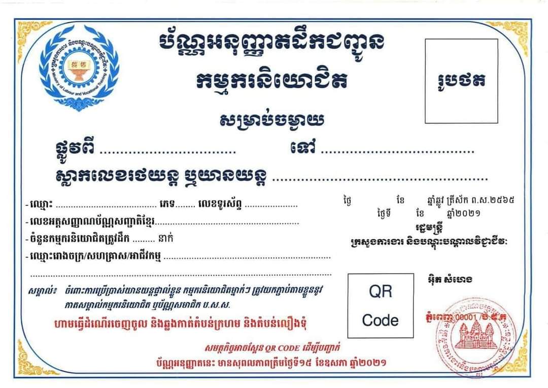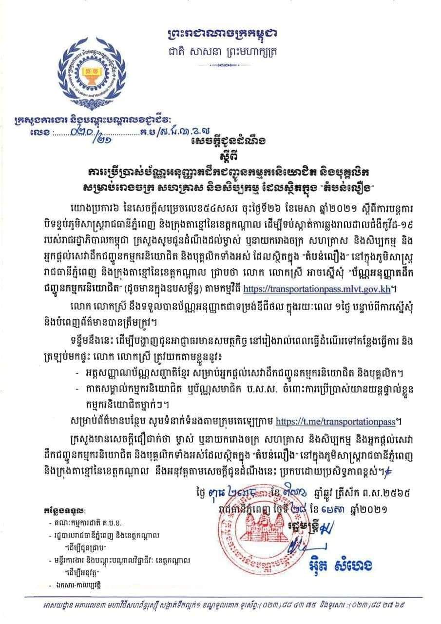 សេចក្តីជូនដំណឹង នៅថ្ងៃទី២៨ ខែមេសានេះ បានបញ្ជាក់ថា ក្រសួងការងារ សូមជូនដំណឹងដល់ម្ចាស់រោងចក្រ សហគ្រាស និងសិប្បកម្ម និង អ្នកផ្តល់សេវាដឹកជញ្ជូនកម្មករនិយោជិត និងបុគ្គលិកទាំងអស់ ដែលស្ថិតក្នុង «តំបន់លឿង» នៅក្នុងភូមិសាស្ត្រ រាជធានីភ្នំពេញ និងក្រុងតាខ្មៅនៃខេត្តកណ្តាល អាចស្នើសុំ «ប័ណ្ណអនុញ្ញាតដឹក ជញ្ជូនកម្មករនិយោជិត» (ដូចមានក្នុងឧបសម្ព័ន្ធ) តាមកម្មវិធី https://transportationpass.mlvt.gov.kh។