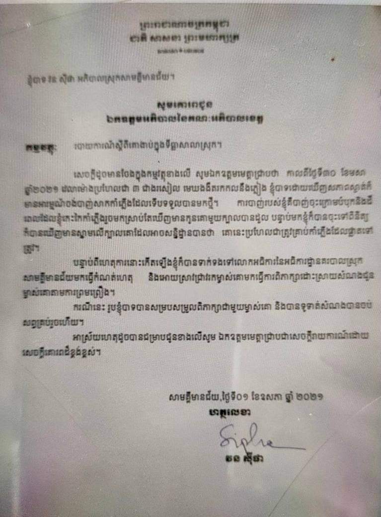 យោងតាមលិខិតមួយច្បាប់របស់លោក វន ស៊ីផា អភិបាលស្រុកសាមគ្គីមានជ័យ ផ្ញើជូនលោកអភិបាលខេត្តកំពង់ឆ្នាំង នៅថ្ងៃទី១ ខែឧសភា ឆ្នាំ២០២១ នេះ បានសរសេរថា ៖