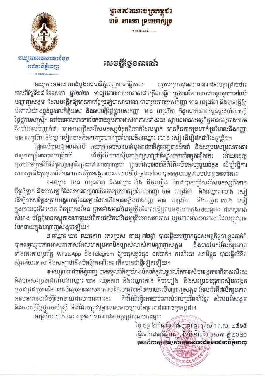 យោងតាមសេចក្តីថ្លែងការណ៍របស់អ្នកនាំពាក្យអយ្យការអមសាលាដំបូងរាជធានីភ្នំពេញ ត្រង់ចំណុចទី៣ បានបញ្ជាក់ថា «អយ្យការរាជធានីភ្នំពេញ បានទទួលពិនិត្យយ៉ាងម៉ត់ចត់នូវលទ្ធផលនៃការស៊ើបអង្កេតករណីខាងលើនេះ និង បានសម្រេចដោះលែងឈ្មោះ ឃន ឈុនតារា និង ឈ្មោះ តាំង គីមហៀង និង សម្រេចបន្តការស៊ើបអង្កេតស្រាវជ្រាវនៃការផលិតរូបភាពអាសអាភាស ដែលត្រូវបានចែកចាយតាមបណ្តាញសង្គម ដែលអំពើផលិតរូបភាពអាសអាភាស ដើម្បីចែកចាយជាសាធារណៈ នេះ គឺ ជាអំពើធ្វើអោយប៉ះពាល់ដល់ប្រពៃណី សីលធម៌សង្គម និង សេចក្តីថ្លៃថ្នូររបស់ស្ត្រី និង ដែលត្រូវផ្តន្ទាទោសតាមច្បាប់នៃព្រះរាជាណាចក្រកម្ពុជា»។
