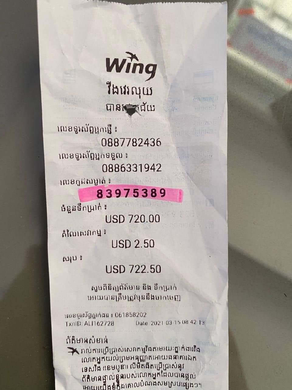 នៅថ្ងៃទី១៥.០៣.២០២១ វេលាម៉ោង៨:៤០នាទី លោក(ឈ្មោះ ឃាង ម៉េងស្រ៊ុន ម្ចាស់ផ្ទះវីង)កំពុងទទួលប្រាក់វិក្កយបត្រអគ្គិសនី និង ចាំទទួលប្រជាពលរដ្ឋដកប្រាក់ដាក់ប្រាក់នៅវីងផ្ទះរបស់ខ្លួន ស្រាប់តែមានស្រ្តីម្នាក់មិនស្គាល់ឈ្មោះបានមកដាក់ប្រាក់ផ្ទេរឲ្យគេដោយប្រើលេខអ្នកផ្ញើរ 088 77 82 436 និងលេខអ្នកទទួល088 63 31 942 ។ ពេលឈ្មោះ ឃាង ម៉េងស្រ៊ុន រៀបចំឯកសារផ្ទេរប្រាក់
