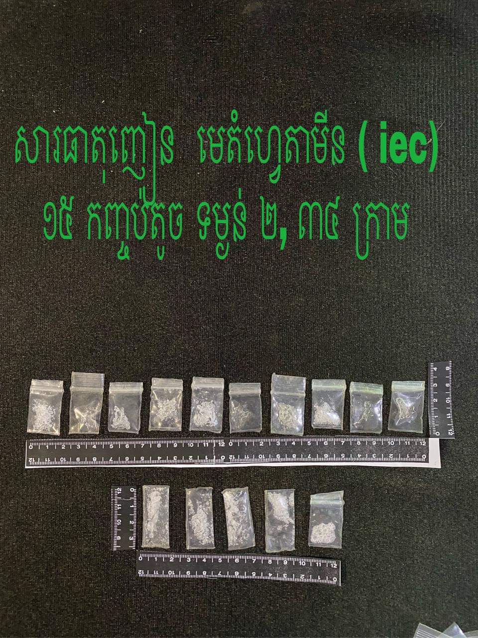 ១_សារធាតុញៀនមេតំហ្វេតាមីន(ice)ប្រភេទម៉ាទឹកកក ចំនួន ១៥ កញ្ចប់តូច ទម្ងន់ ២,៣៤ក្រាម ។