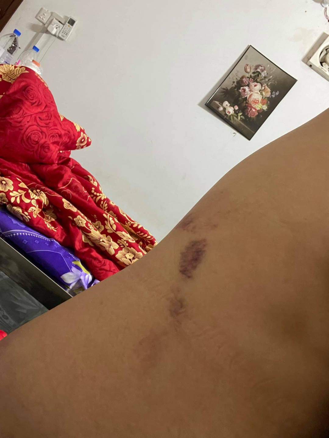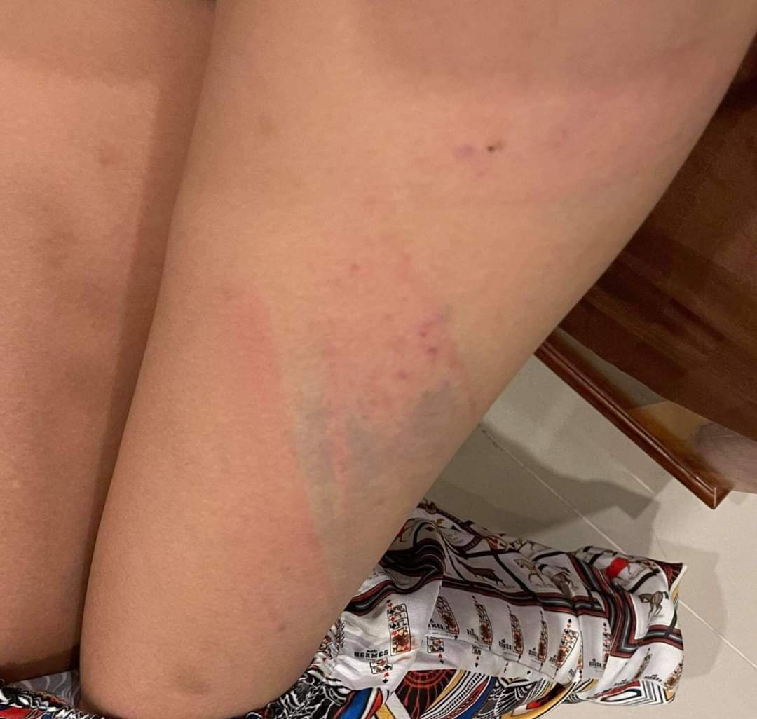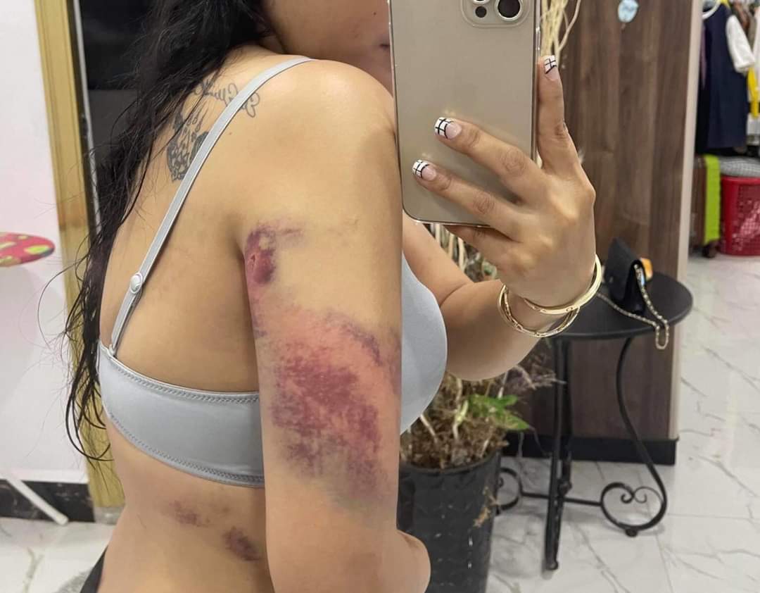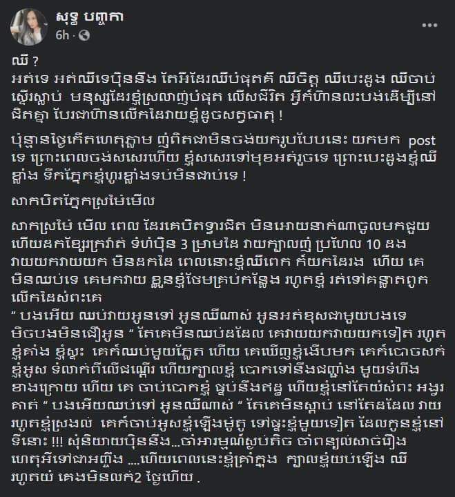 សារបិទភ្នែកស្រមៃមើល សាកស្រមៃមើល ពេលដែលគេបិទទ្វារ មិនឲ្យអ្នកណាចូលមកជួយហើយដកខ្សែក្រវាត់ទំហំប៉ុន៣ម្រាមដៃ វាយក្បាលខ្ញុំប្រហែល១០ដង វាយយកវាយយកមិនដកដៃ ។ ពេលនោះ ខ្ញុំឈឺពេកក៏យកដៃរងហើយគេមិនឈប់ទេគេមកវាយខ្លួនខ្ញុំថែមគ្រប់កន្លែងរហូតខ្ញុំរត់ទៅ កន្លៀតពួនលើកដៃសំពះគេ «បងអើយឈប់វាយទៅ អូនឈឺណាស់ អូនអត់ខុសជាមួយបងទេ ម៉េចបងមិនជឿអូន» តែគេមិនឈប់ដដែលគេវាយយកវាយយកទៀតរហូតខ្ញុំគាំង សុំស្ទះ គេក៏ឈប់មួយភ្លែតហើយគេ មកបោចសក់ខ្ញុំទម្លាក់ពីលើជណ្តើរ ហើយក្បាលខ្ញុំបោកទៅនឹងជញ្ជាំងមួយទំហឹងខាងក្រោយ ហើយគេចាប់បោកខ្ញុំខ្ទប់លើកឥដ្ឋហើយខ្ញុំនៅតែយំសំពះអង្វរគាត់ «បងអើយឈប់ទៅអូនឈឺណាស់តែគេមិនស្ដាប់នៅតែដដែល» វាយរហូត ខ្ញុំស្រងល់ ក្រោយមកគេក៏ចាប់អូសខ្ញុំឡើងម៉ូតូទៅផ្ទះខ្ញុំមួយទៀតដែលកូនខ្ញុំនៅទីនោះ ។